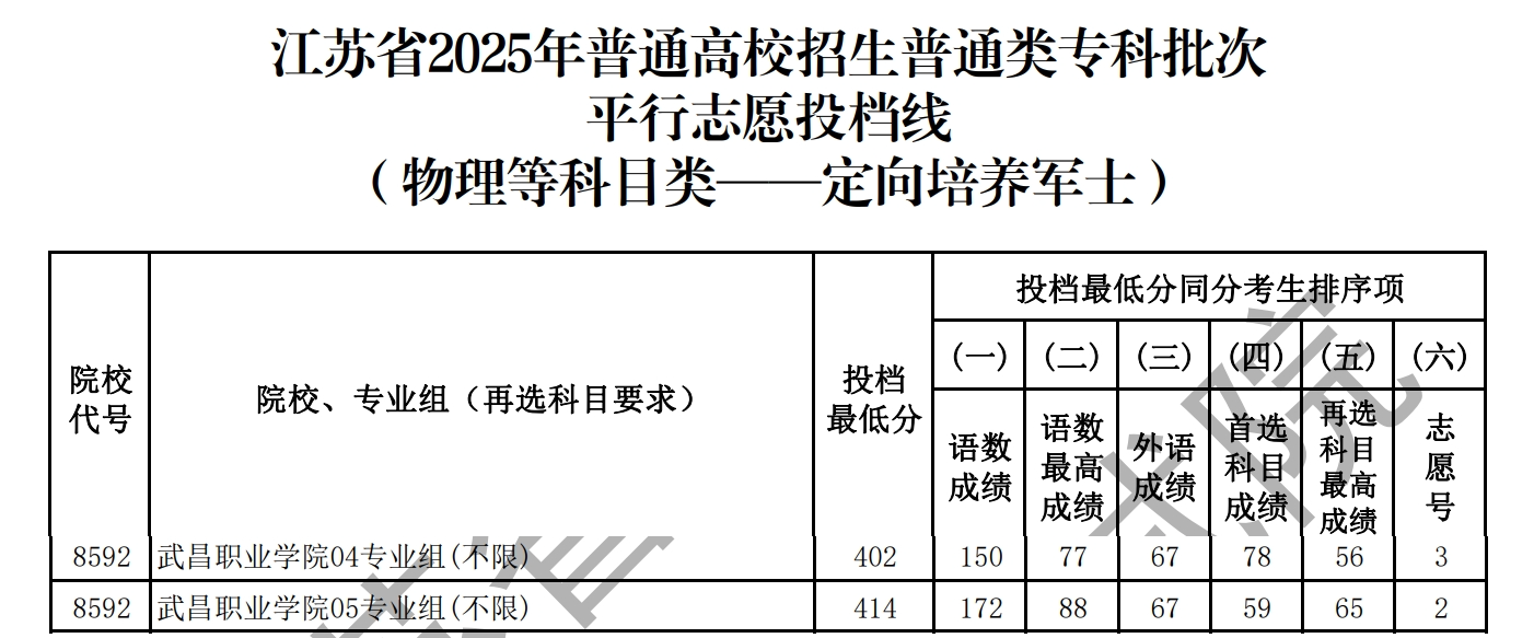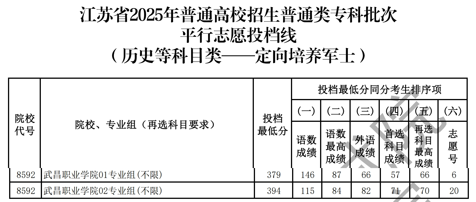 2025武昌职业学院定向士官录取线已公布!例如在安徽省物理类最低分427分、历史类最低分425分;江苏省物理类最低分402分、历史类最低分379分。