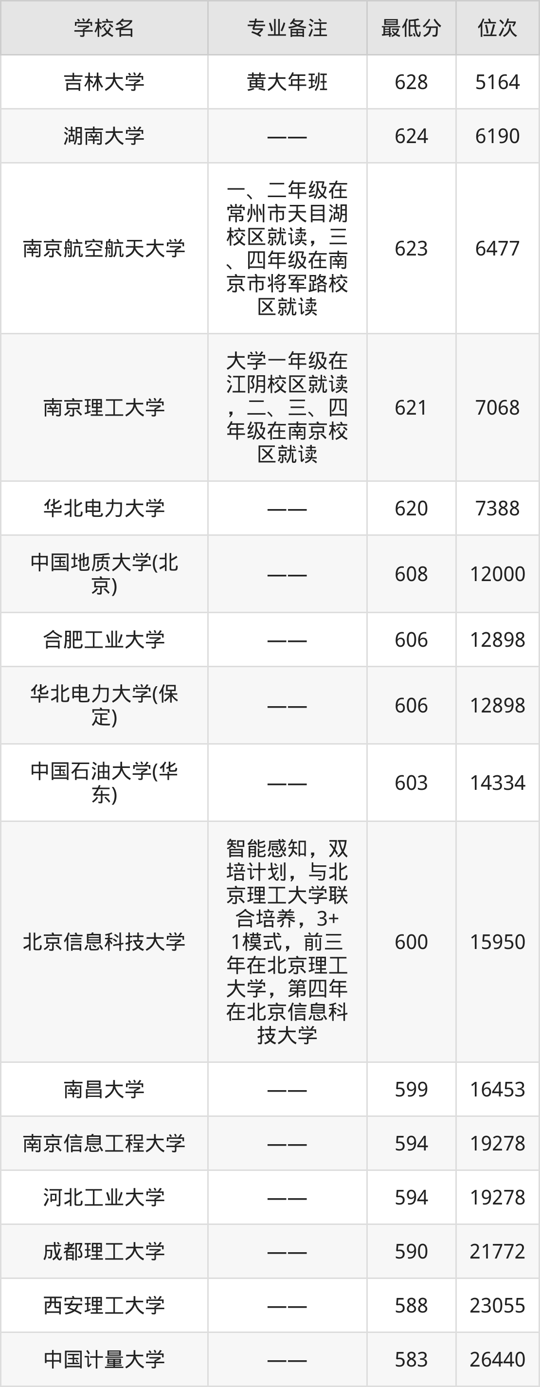 测控技术与仪器分数线排名前五的院校分别是:628分的吉林大学(黄大年班)、624分的湖南大学、623分的南京航空航天大学(一、二年级在常州市天目湖校区就读,三、四年级在南京市将军路校区就读)、621分的南京理工大学(大学一年级在江阴校区就读,二、三、四年级在南京校区就读)、620分的华北电力大学。