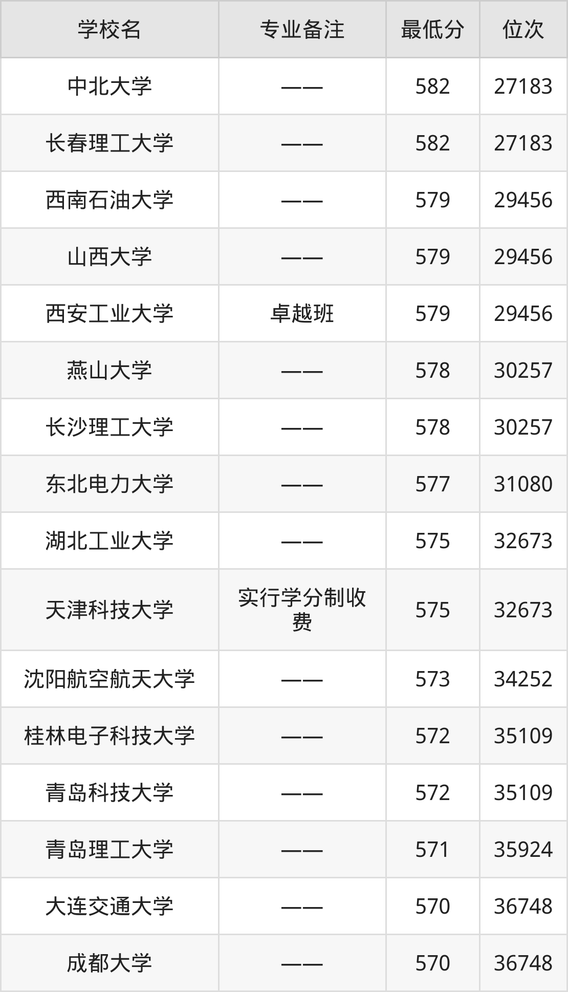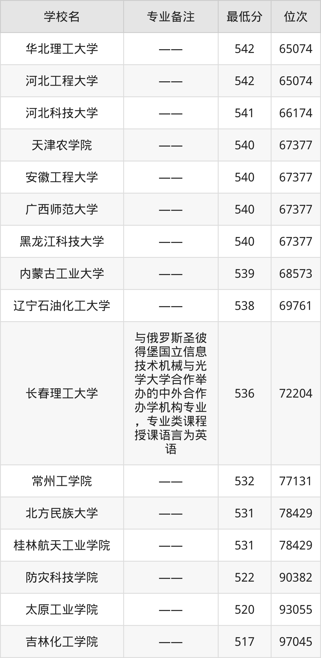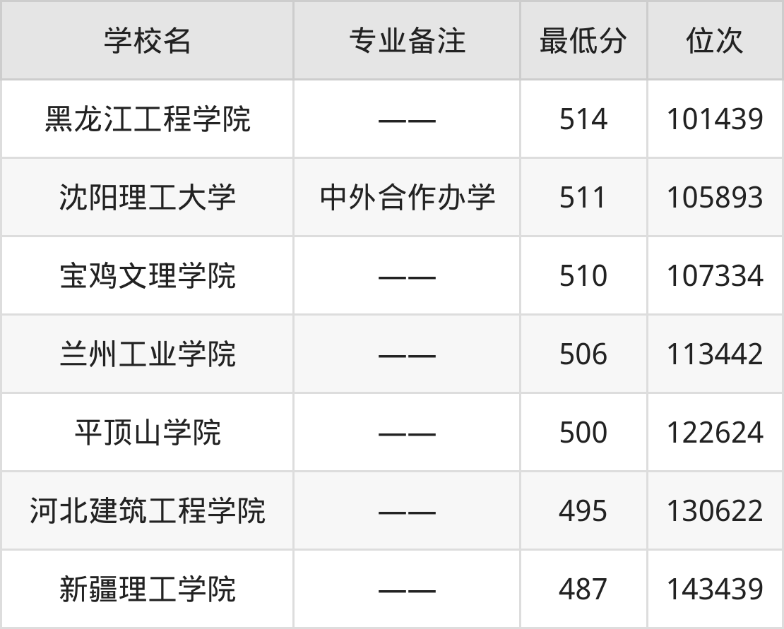 分数线低于510分能上的测控技术与仪器大学还有宝鸡文理学院(510分)、兰州工业学院(506分)、平顶山学院(500分)、河北建筑工程学院(495分)。