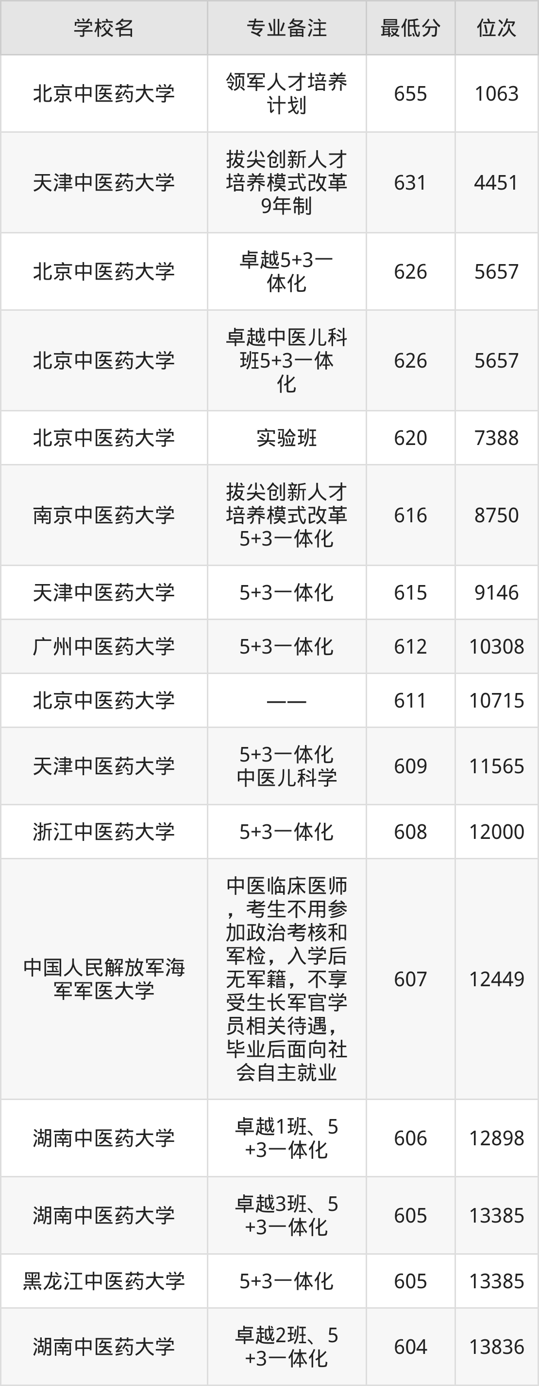 中医学分数线排名前五的院校分别是:655分的北京中医药大学(领军人才培养计划)、631分的天津中医药大学(拔尖创新人才培养模式改革9年制)、616分的南京中医药大学(拔尖创新人才培养模式改革5+3一体化)、612分的广州中医药大学(5+3一体化)、608分的浙江中医药大学(5+3一体化)。