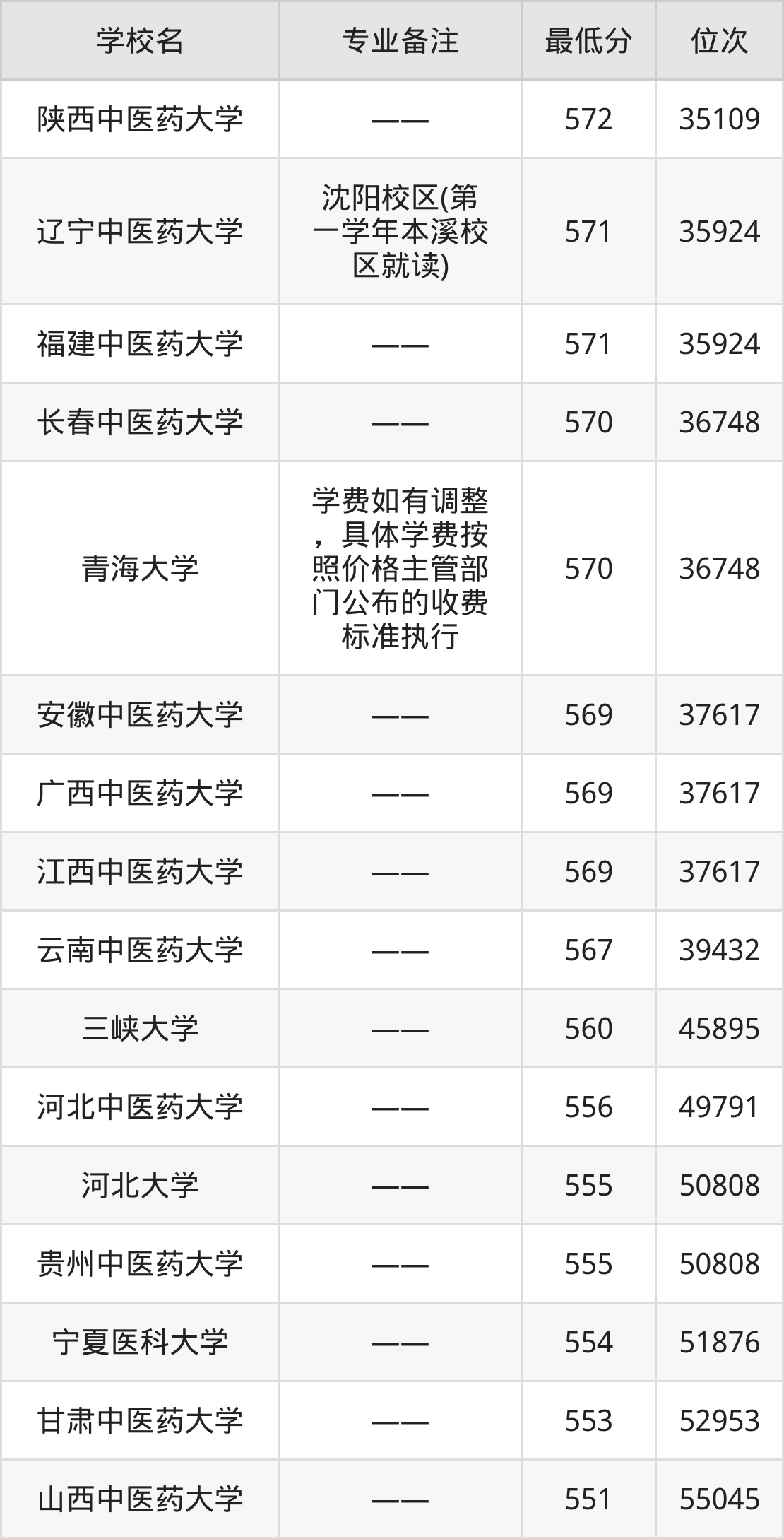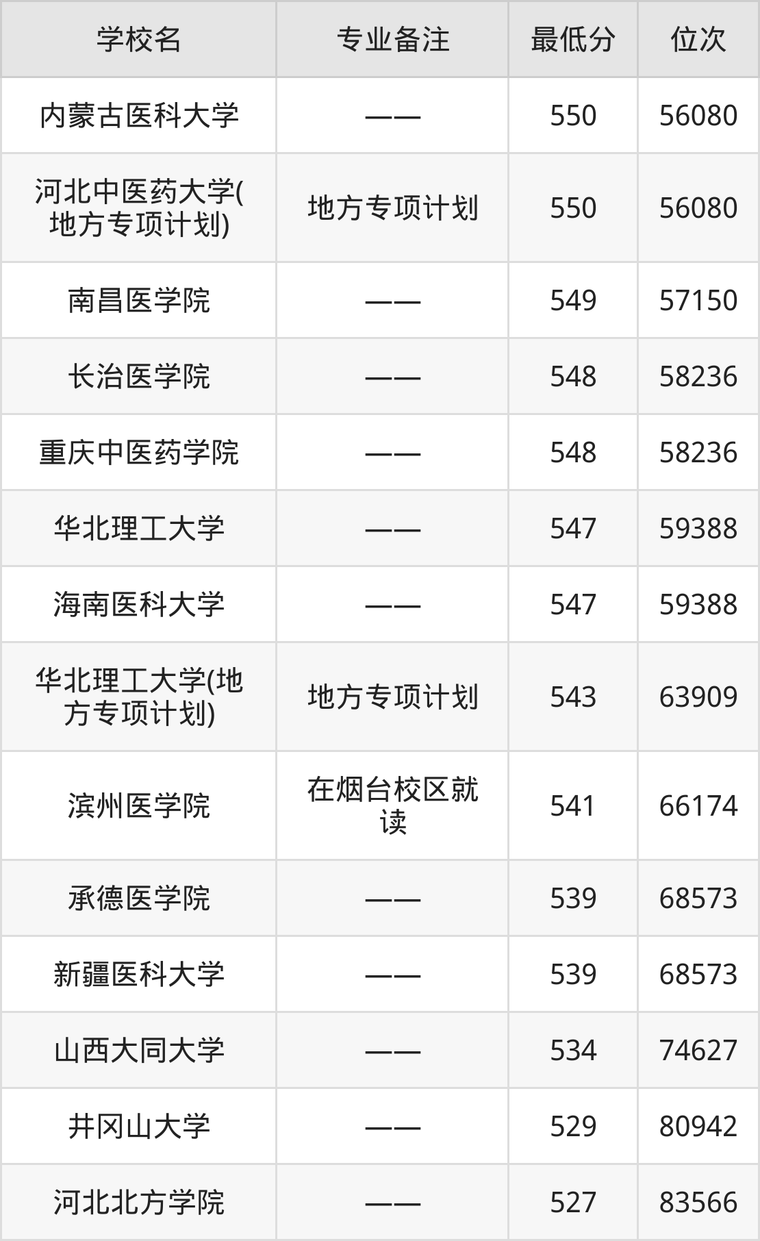 分数线低于540分能上的中医学大学还有承德医学院(539分)、新疆医科大学(539分)、山西大同大学(534分)、井冈山大学(529分)。