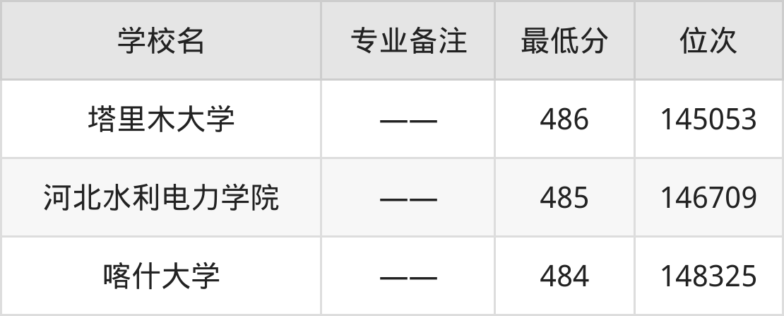 分数线低于500分能上的道路桥梁与渡河工程大学还有河北建筑工程学院(493分)、白城师范学院(488分)、塔里木大学(486分)、河北水利电力学院(485分)。