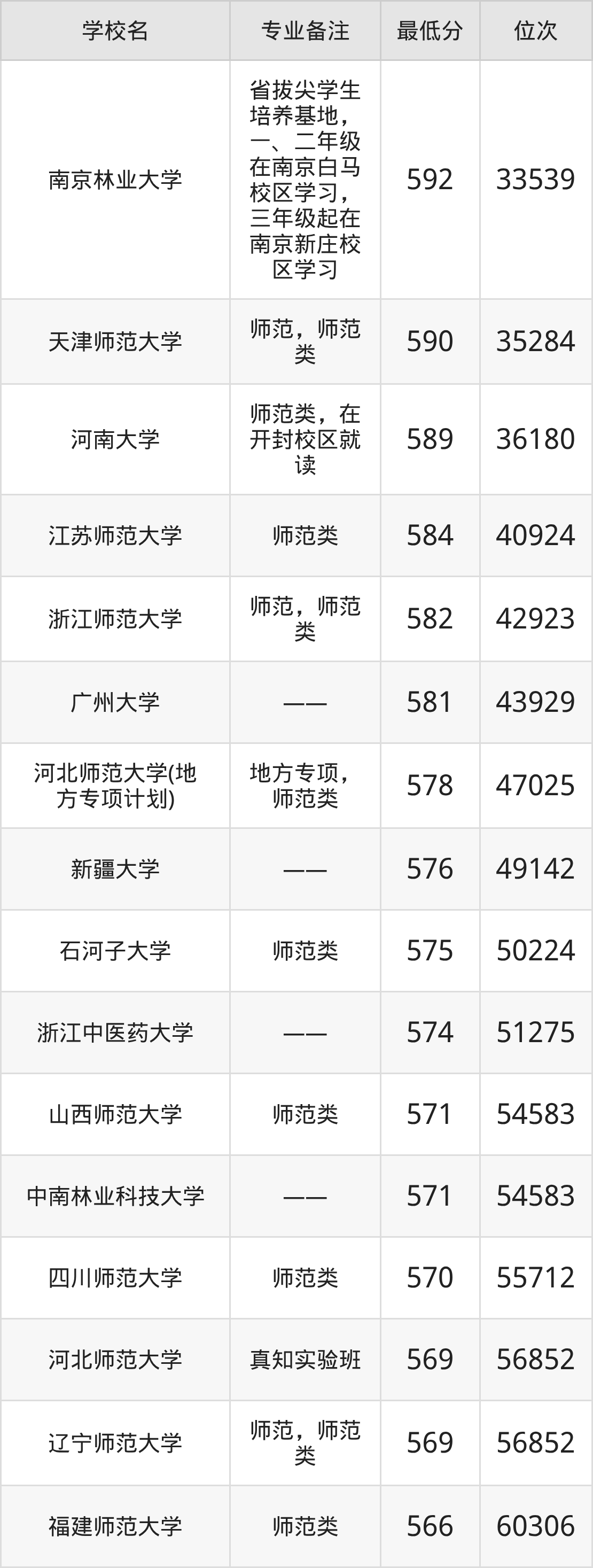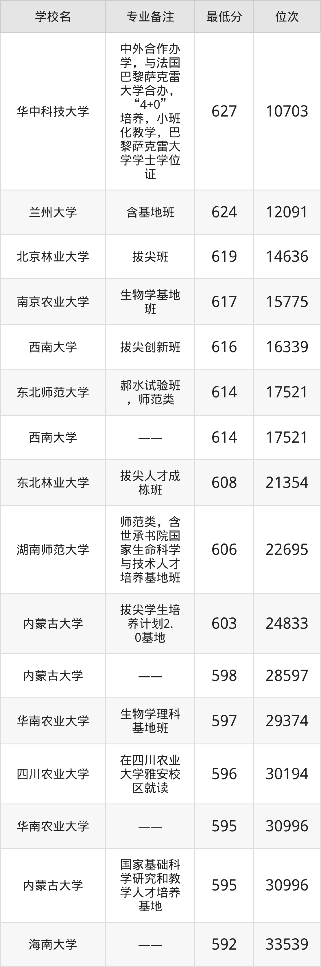 600分左右的生物科学大学有:内蒙古大学598分、内蒙古大学(拔尖学生培养计划2.0基地)603分、华南农业大学597分、四川农业大学596分。