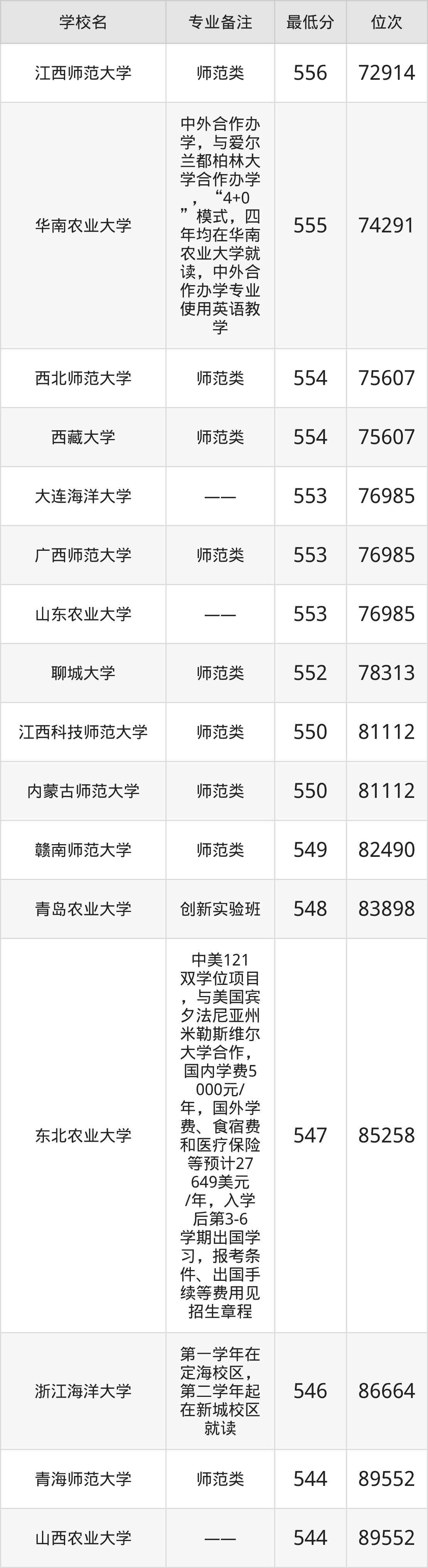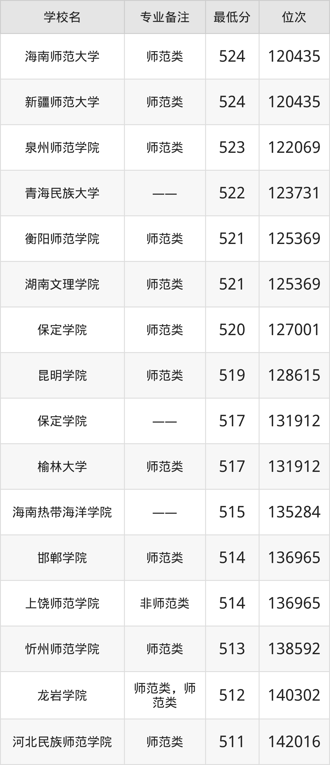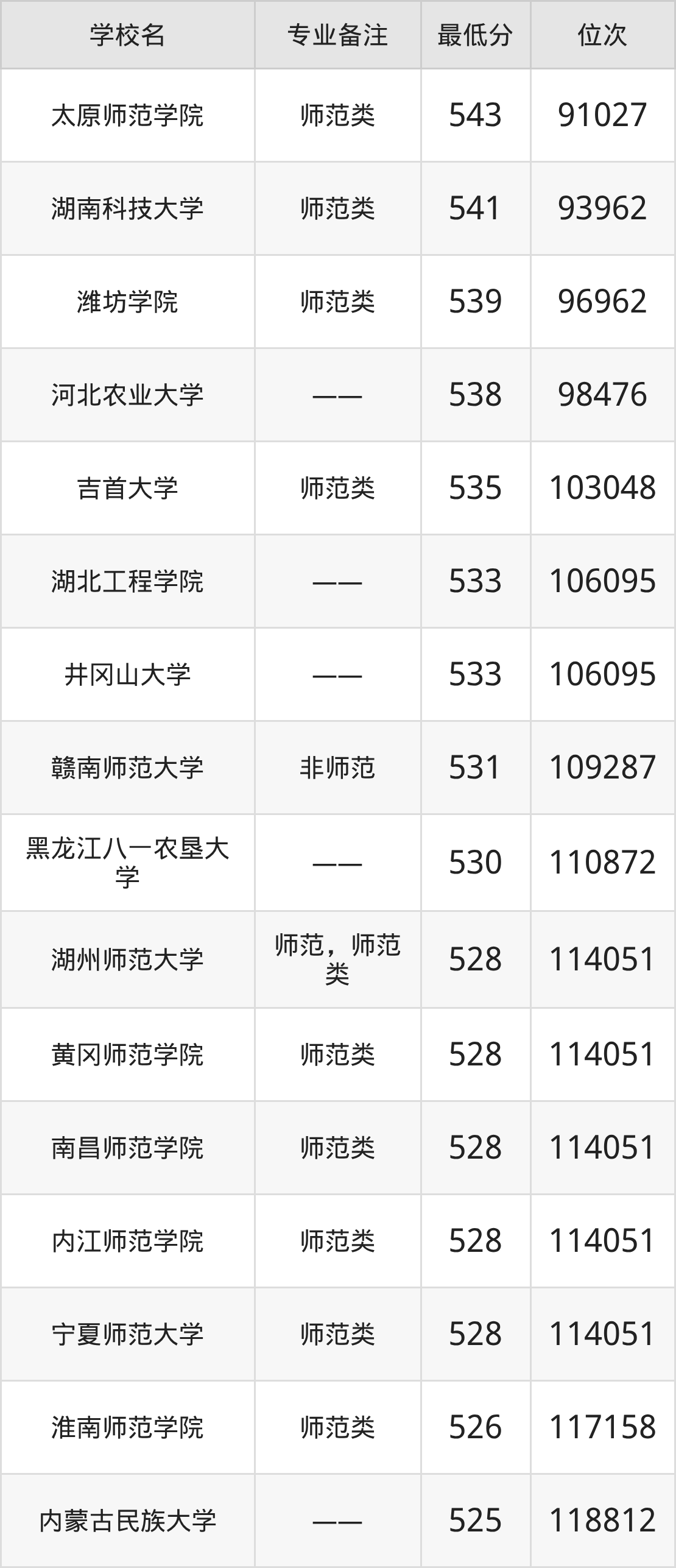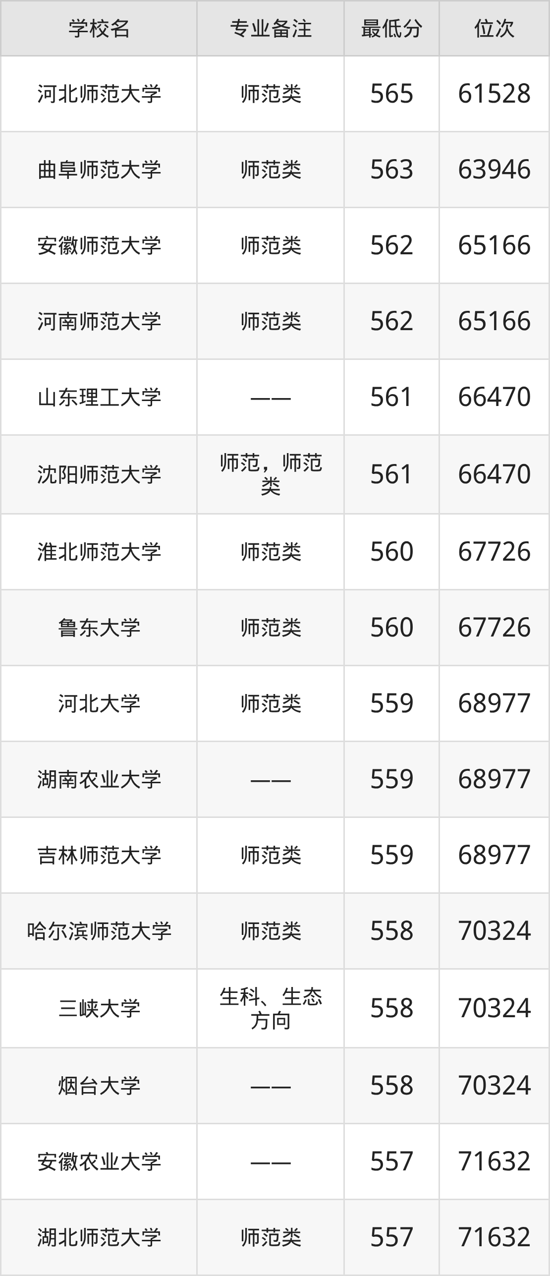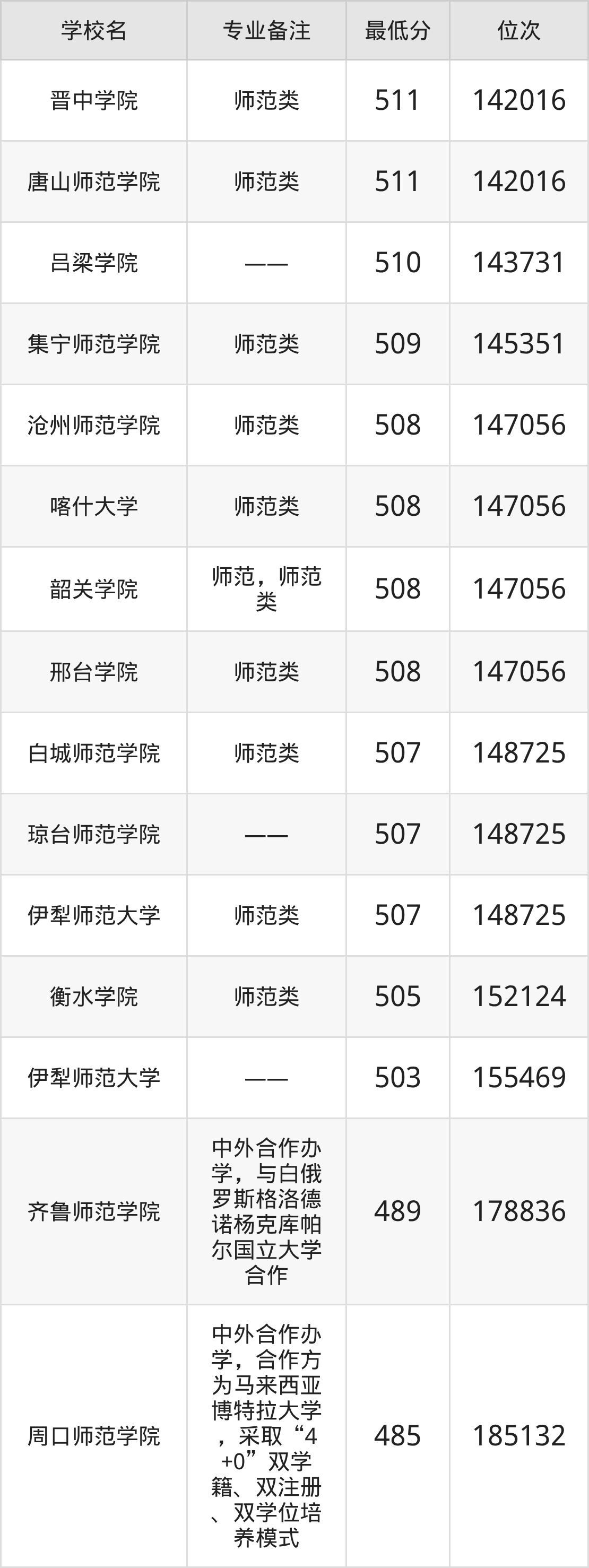 分数线低于510分能上的生物科学大学还有伊犁师范大学(507分)、衡水学院(505分)、伊犁师范大学(503分)、齐鲁师范学院(489分)。