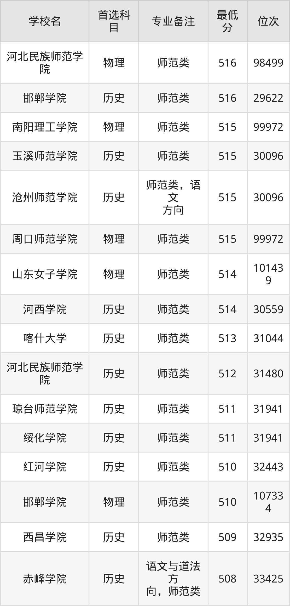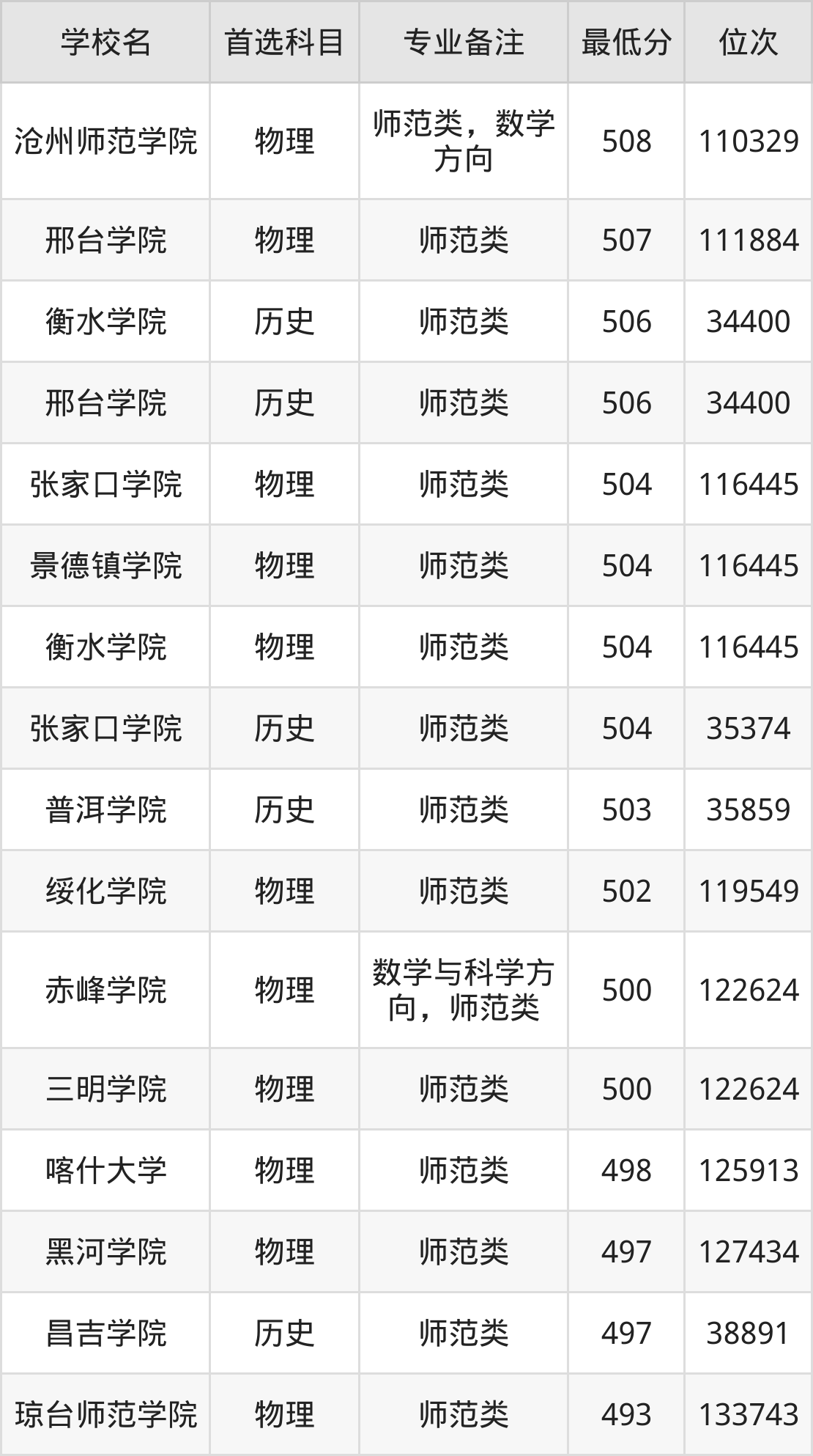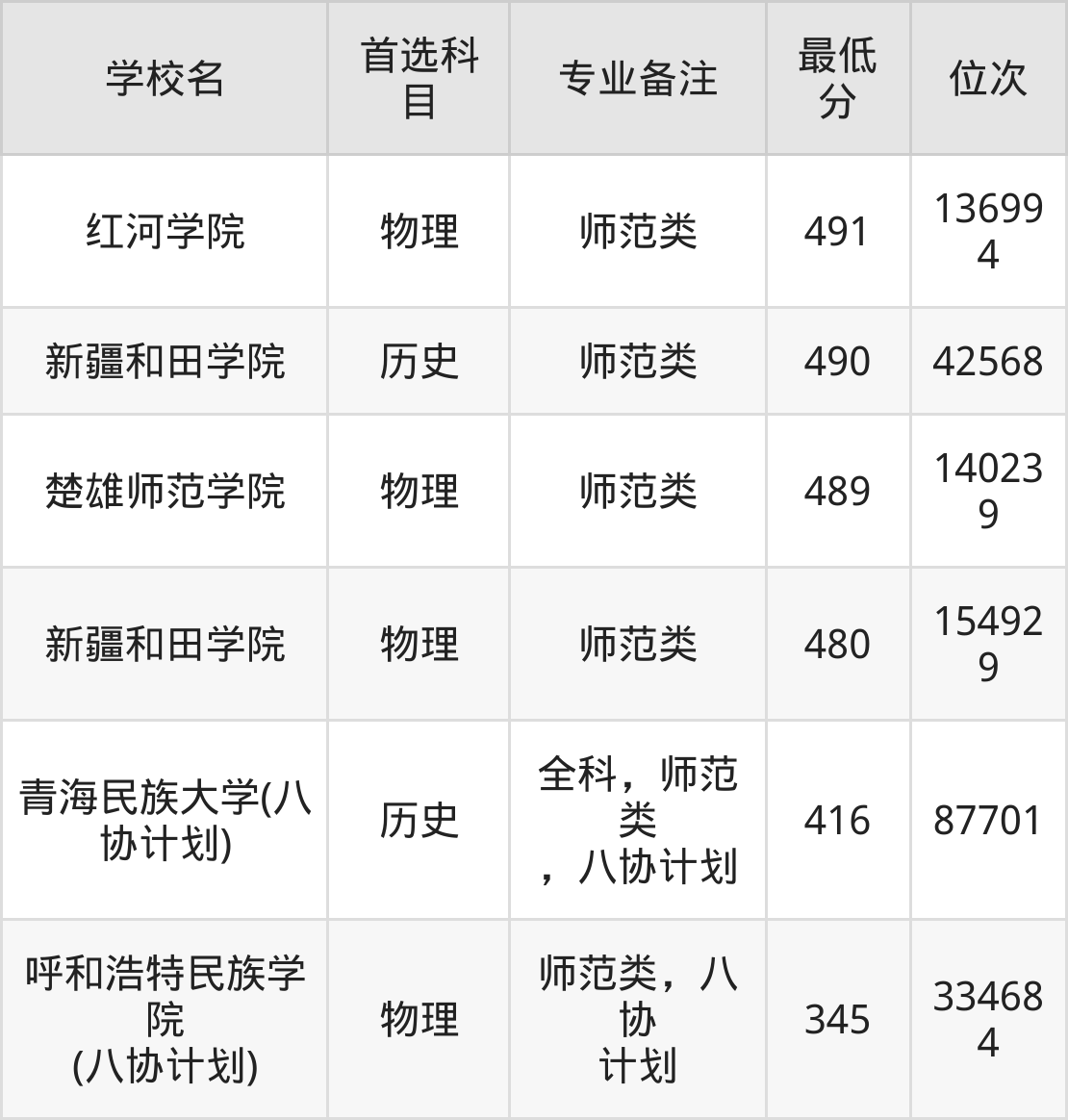 分数线低于490分能上的小学教育大学还有新疆和田学院(490分)、楚雄师范学院(489分)、新疆和田学院(480分)、青海民族大学(八协计划)(416分)。