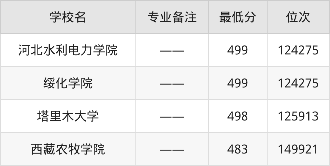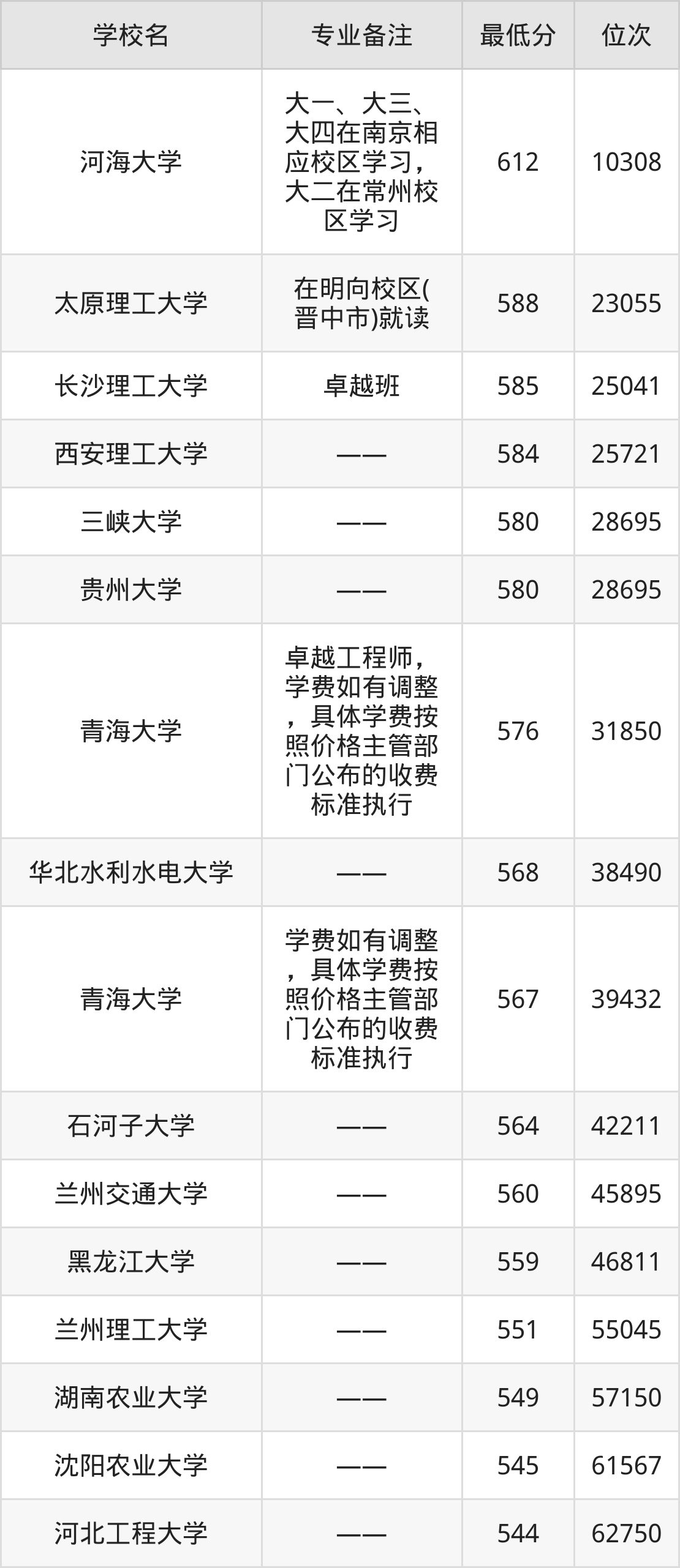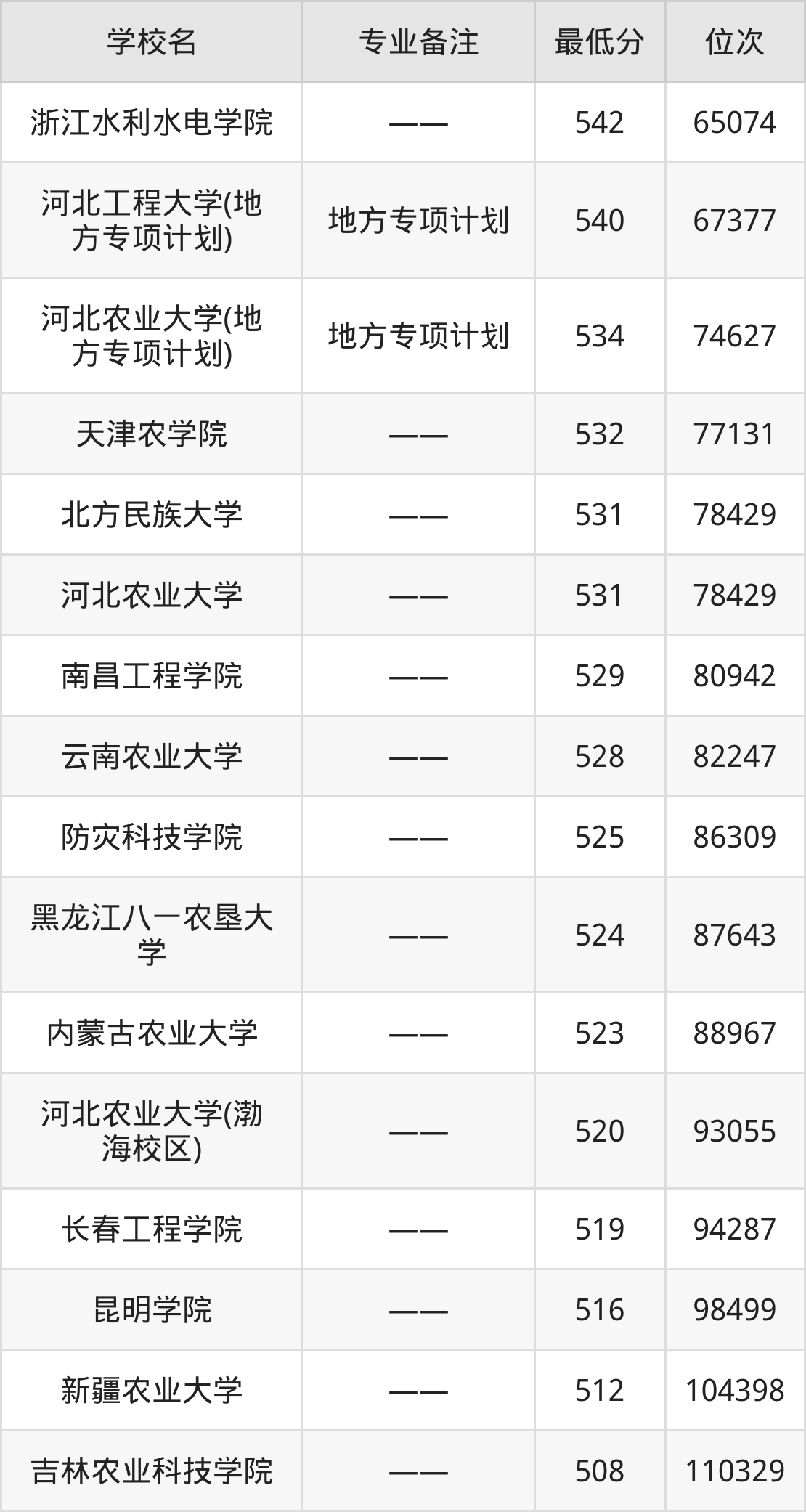 分数线低于510分能上的水利水电工程大学还有吉林农业科技学院(508分)、河北水利电力学院(499分)、绥化学院(499分)、塔里木大学(498分)。