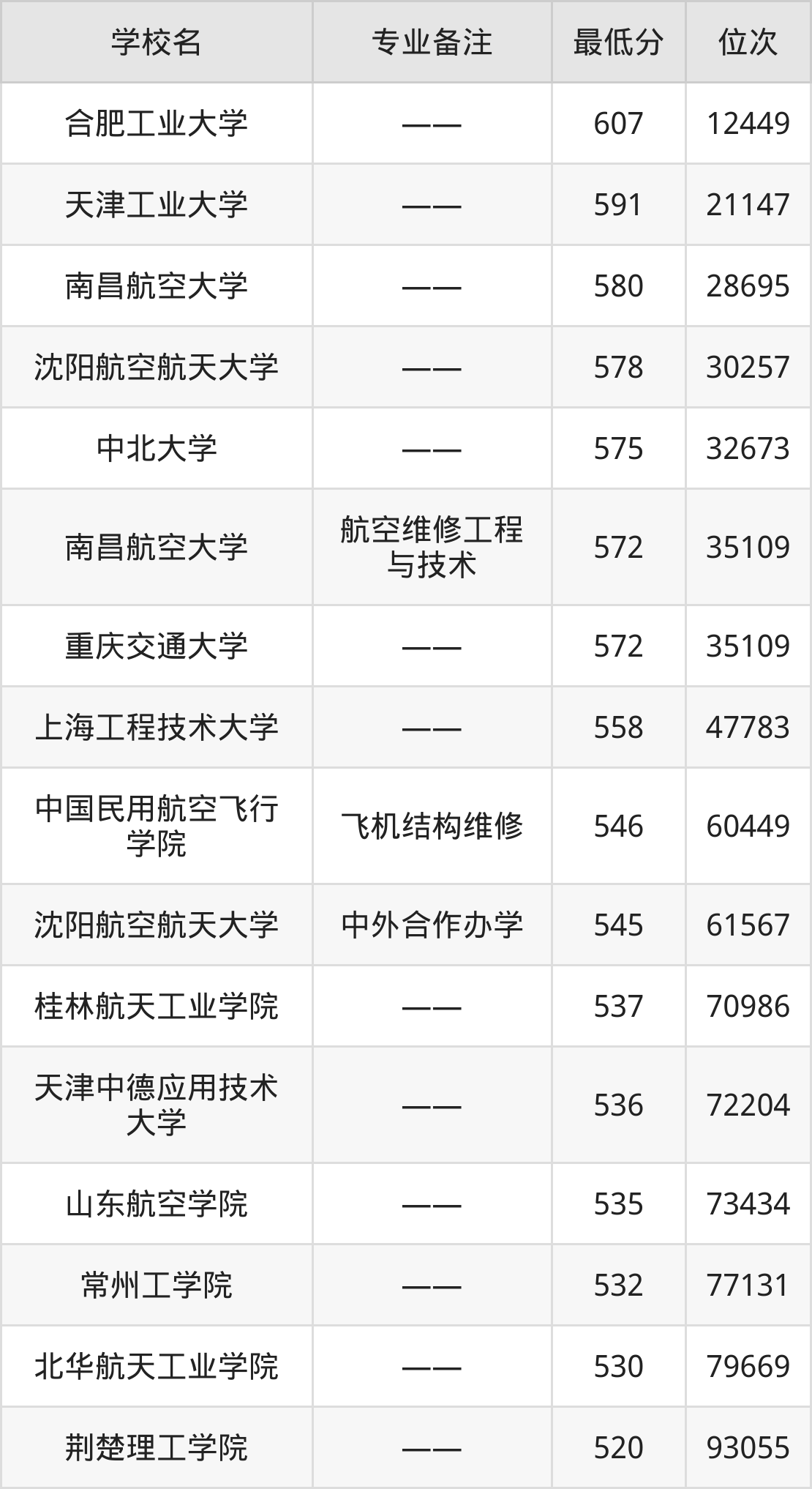 三、飞行器制造工程专业录取分数线