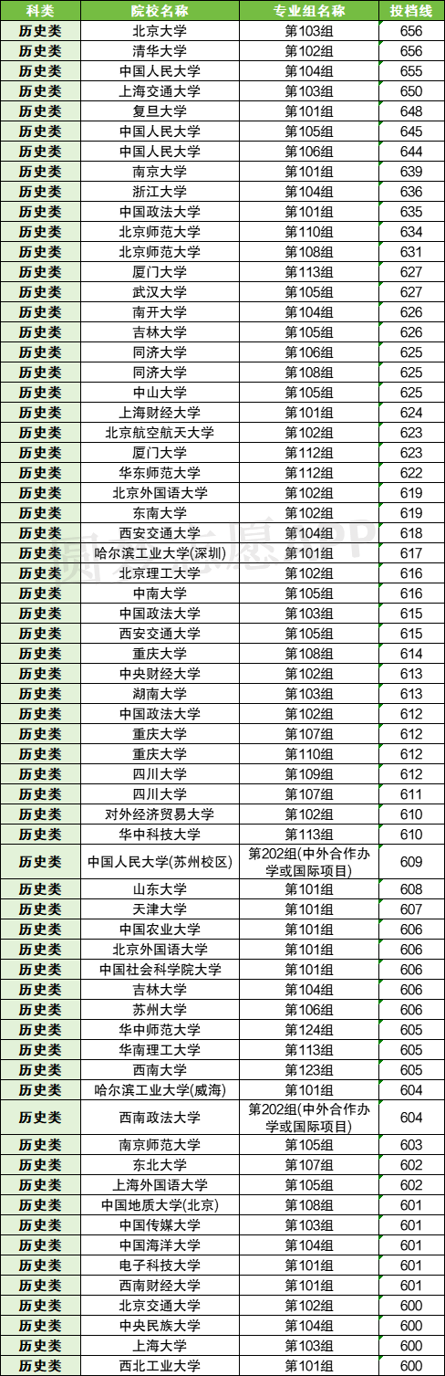 分数排名前五十的基本属于文科实力较强的985或211院校的专业组,其中较为好考的有华中师范大学124组、苏州大学106组、吉林大学104组、中国社会科学院大学101组,如果想考上这些专业组,分数至少要达到605分。