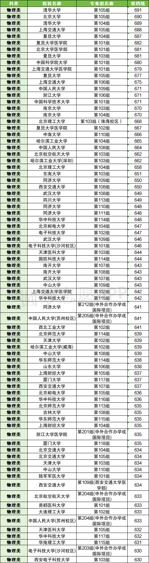 分数线排名前五十的基本都属于工科实力较强的985院校的专业组,其中较为好考的有天津大学102组、北京师范大学114组、西北工业大学102组、同济大学212组,如果想考上这些专业组,分数至少要达到640分。