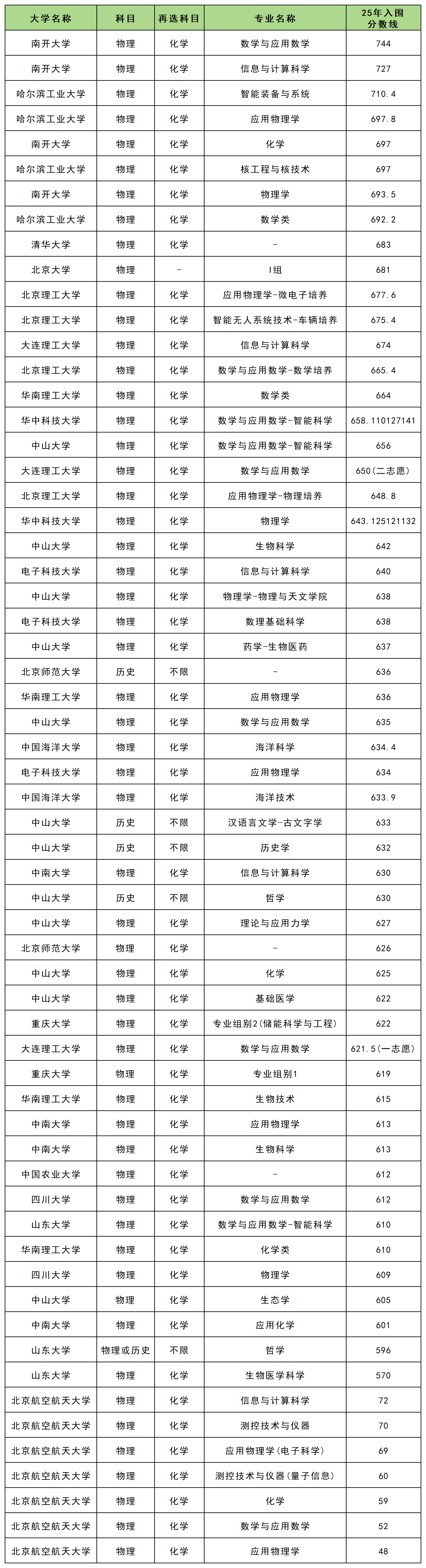 广东强基计划的招生院校有北京大学、中山大学、华南理工大学等32所高校,2025年各高校强基计划在广东的入围分数线为:中山大学物理类605分、华南理工大学物理类610分、北京大学物理类681分等。