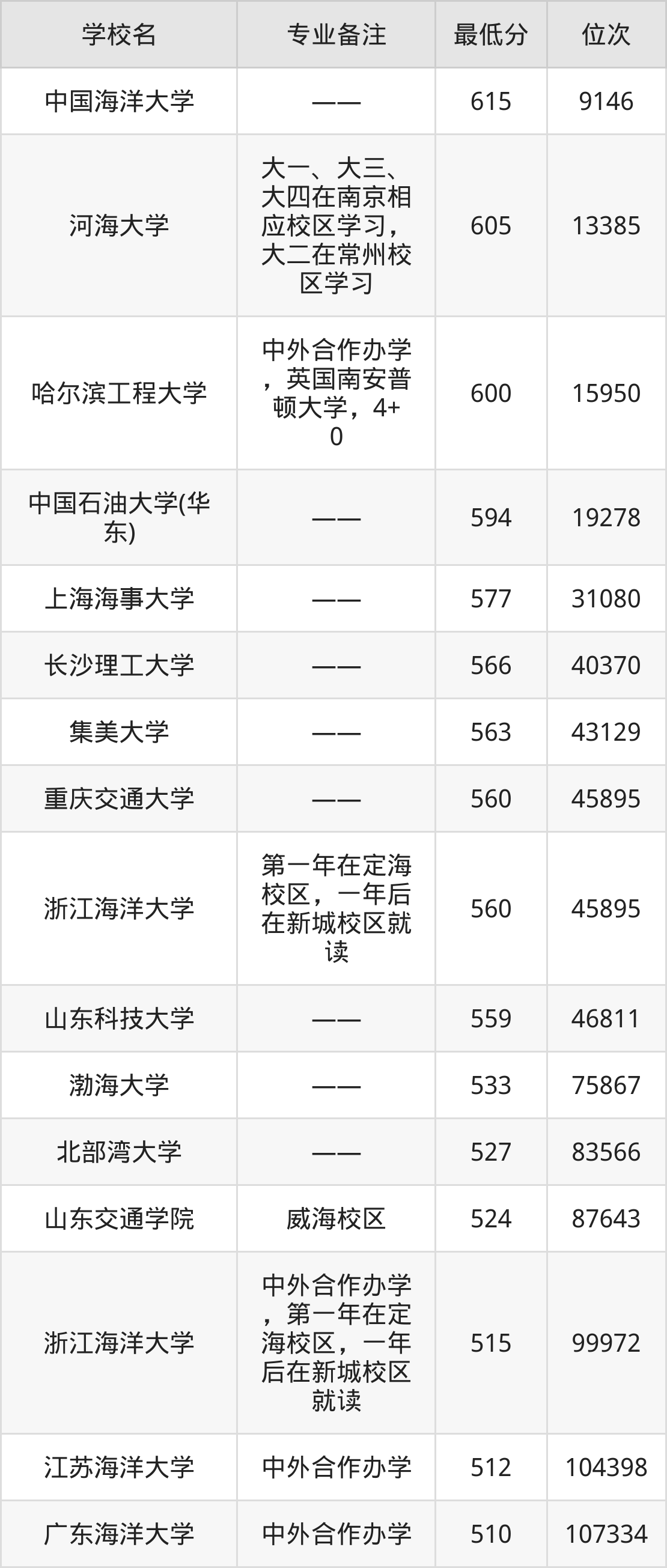 分数线低于530分能上的船舶与海洋工程大学还有北部湾大学(527分)、山东交通学院(524分)、浙江海洋大学(515分)、江苏海洋大学(512分)。