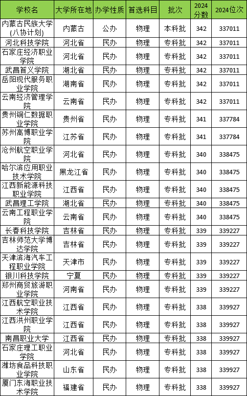 可以看到,2024年河北省高考340分左右的物理类考生可以报考内蒙古民族大学(八协计划)342分、河北科技学院342分、武昌首义学院342分等。