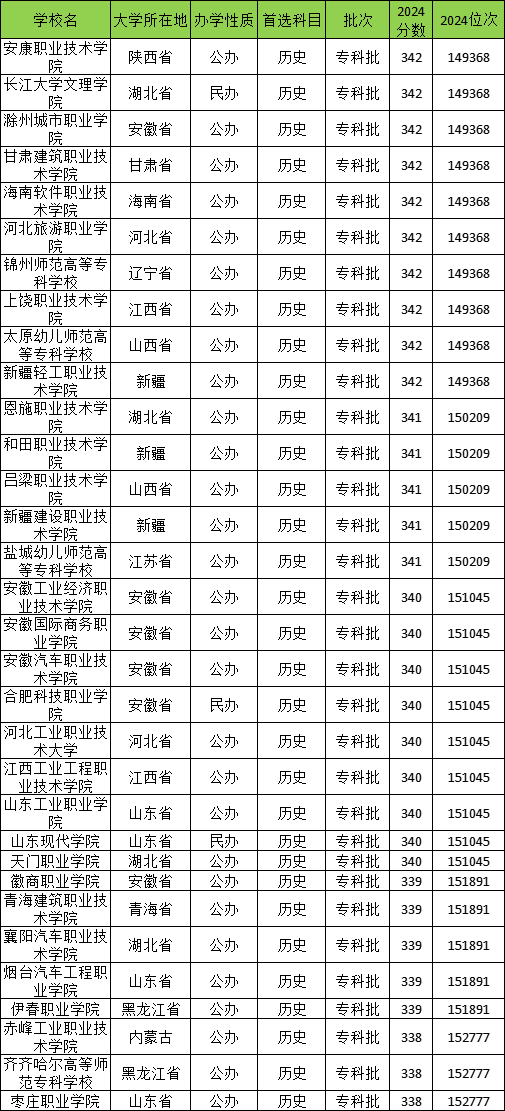 可以看到,2024年河北省高考340分左右的历史类考生可以报考安康职业技术学院342分、长江大学文理学院342分、甘肃建筑职业技术学院342分等。