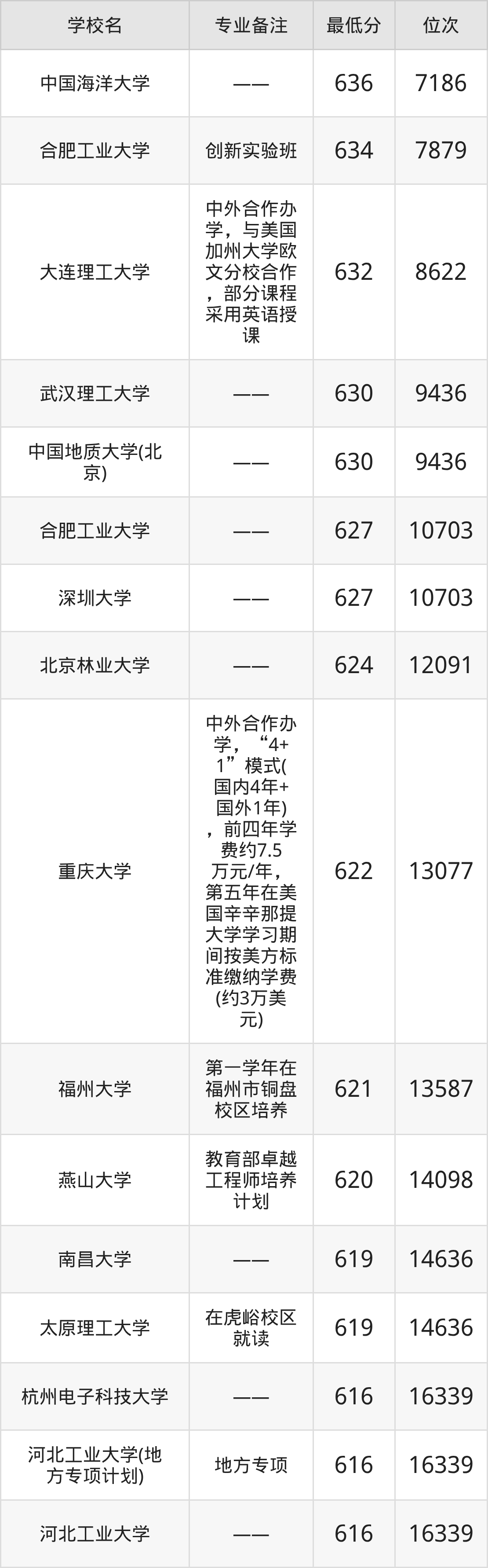 机械设计制造及其自动化分数线排名前五的院校分别是:636分的中国海洋大学、634分的合肥工业大学(创新实验班)、632分的大连理工大学(中外合作办学,与美国加州大学欧文分校合作,部分课程采用英语授课)、630分的武汉理工大学、630分的中国地质大学(北京)。
