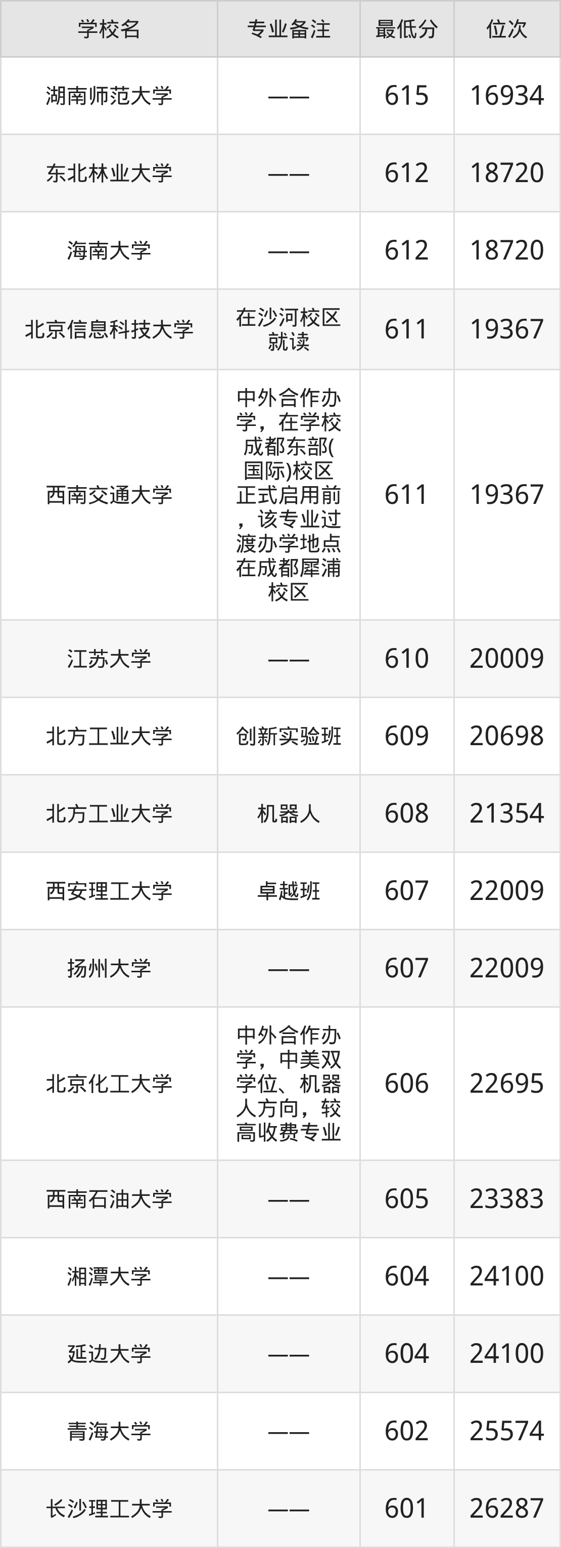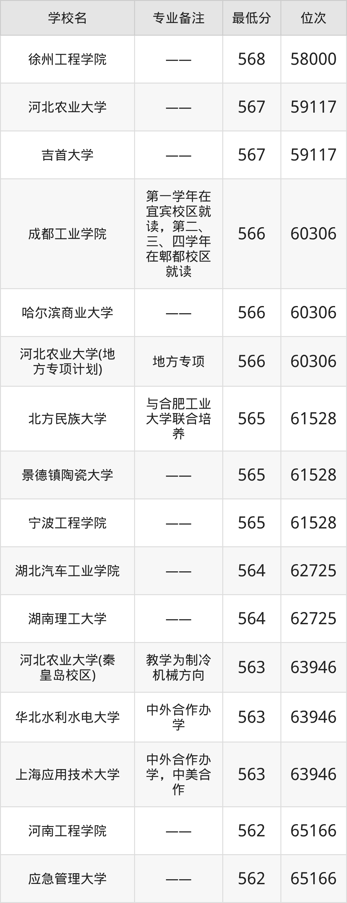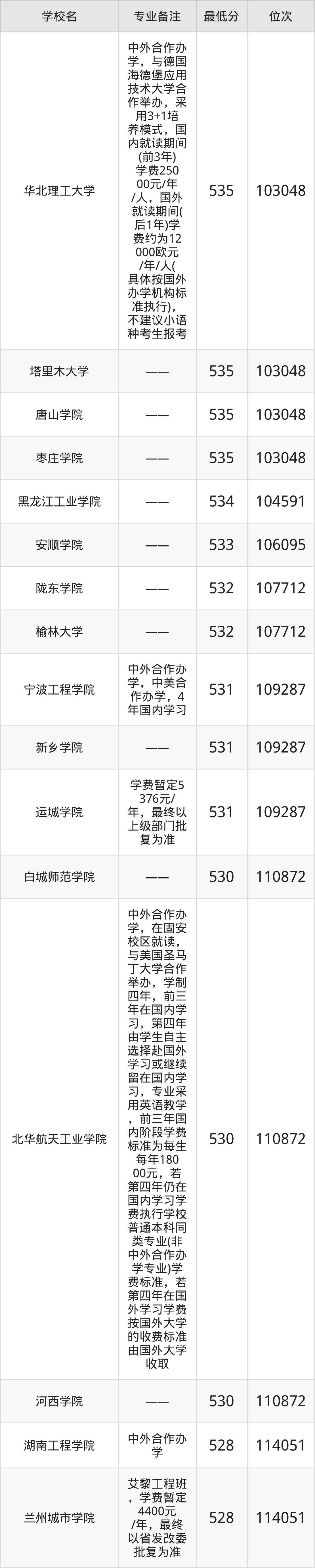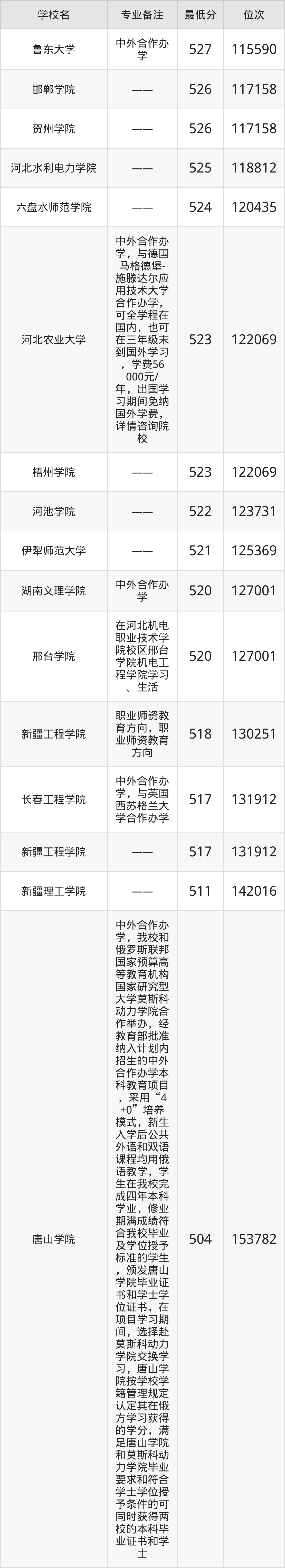 分数线低于520分能上的机械设计制造及其自动化大学还有新疆工程学院(517分)、新疆理工学院(511分)、唐山学院(504分)、吉林工程技术师范学院(502分)。