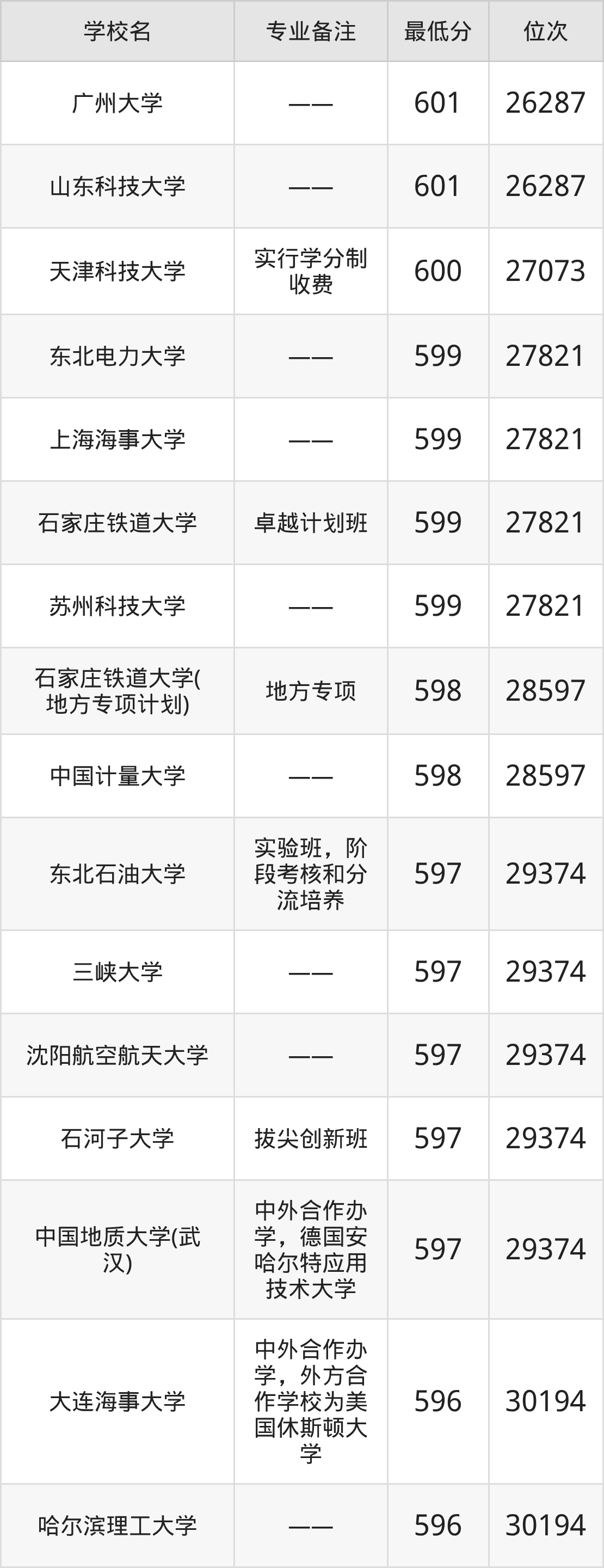 600分左右的机械设计制造及其自动化大学有:天津科技大学600分、长沙理工大学601分、广州大学601分、山东科技大学601分。