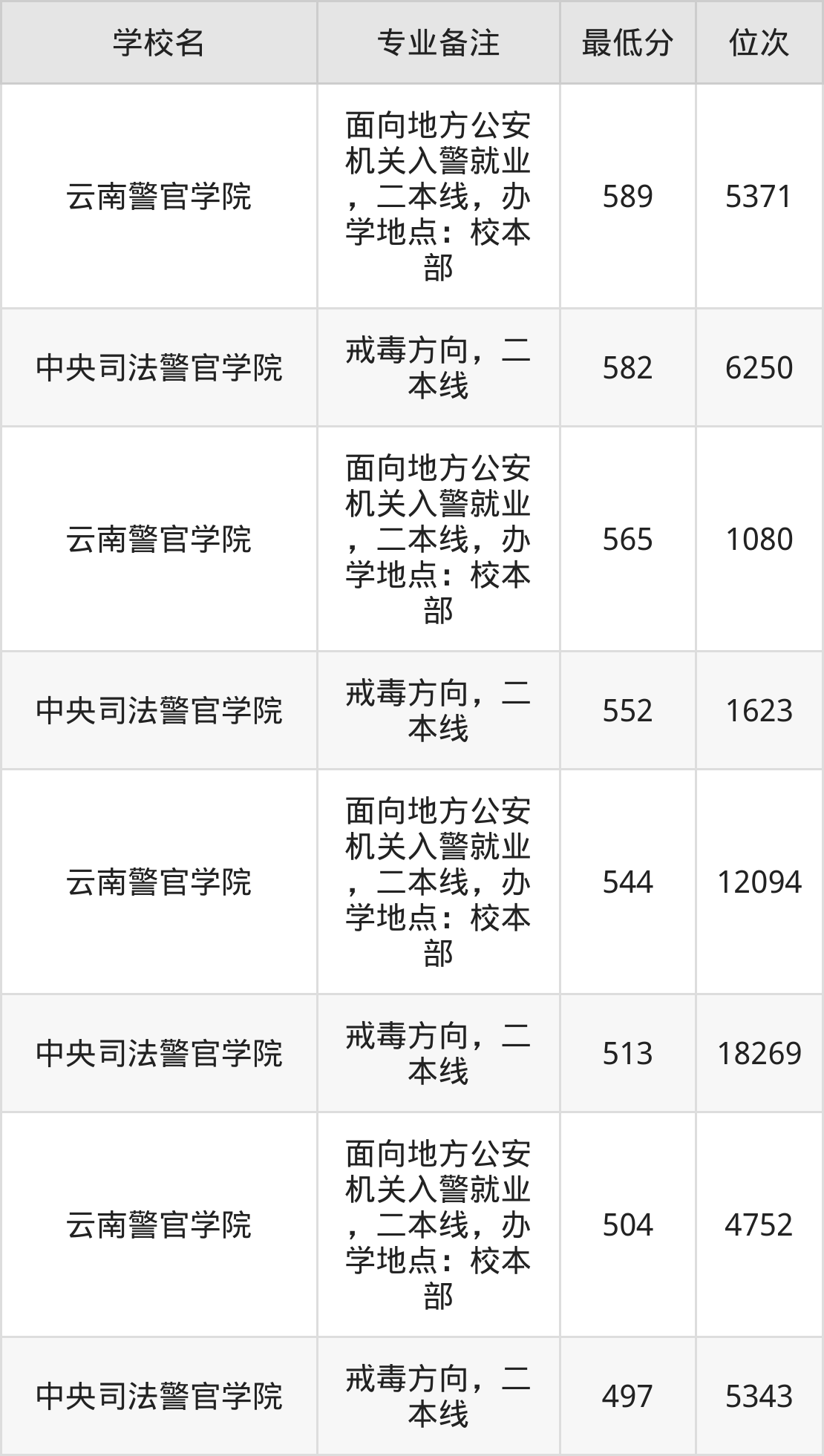 院校举例:中央司法警官学院、中国刑事警察学院、云南警官学院、甘肃政法大学、新疆警察学院。