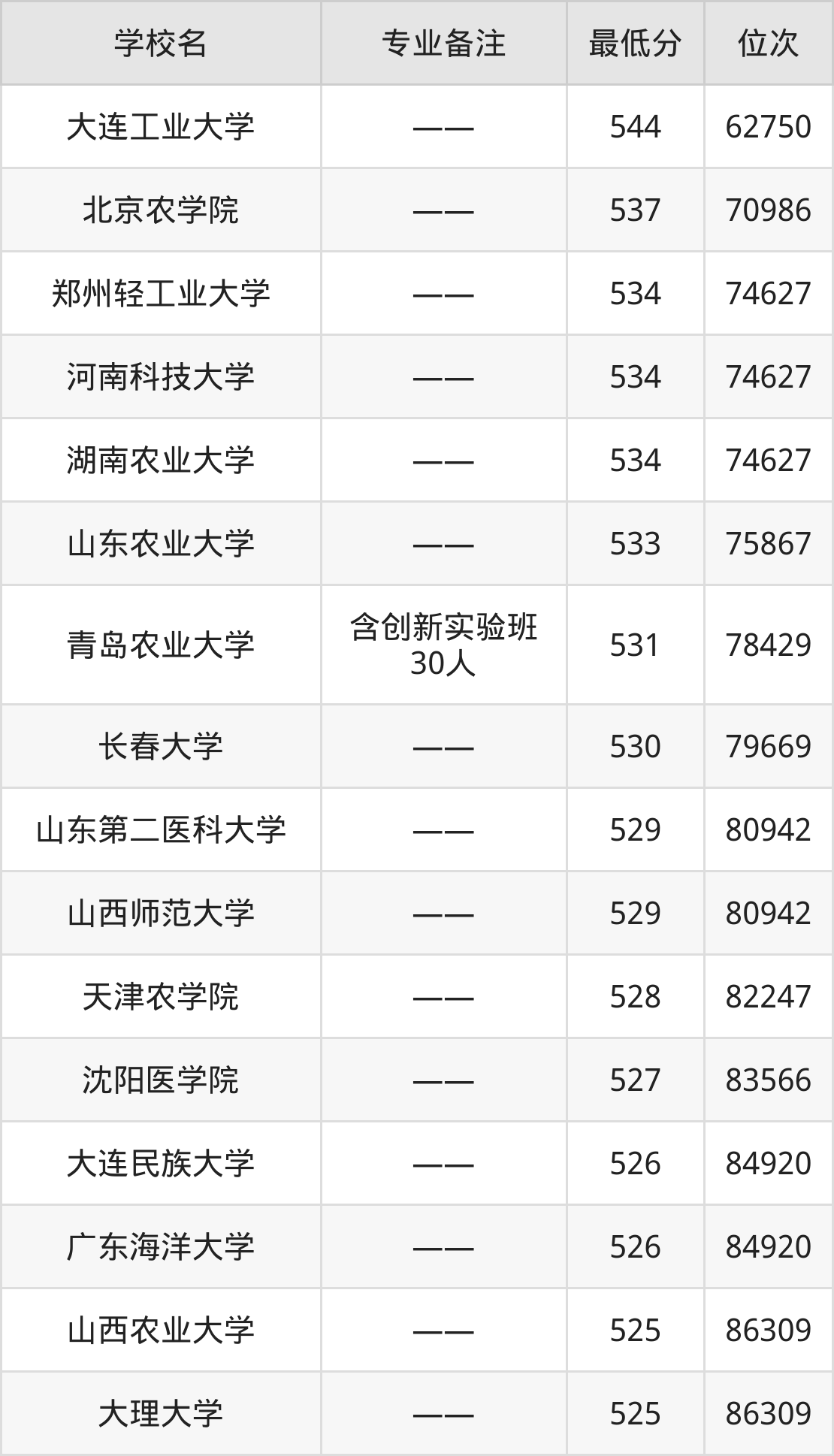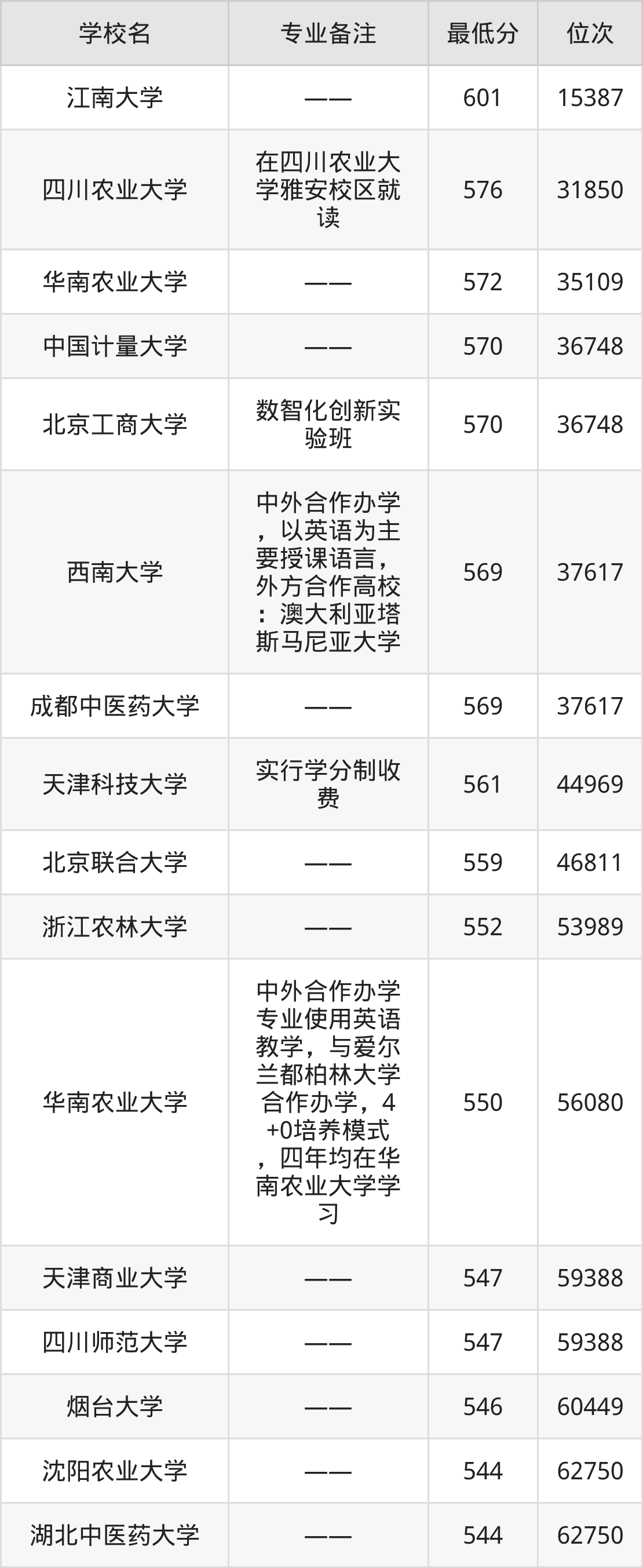 分数线低于490分能上的食品质量与安全大学还有绥化学院(486分)、伊犁师范大学(485分)、西藏农牧学院(476分)、内蒙古民族大学(八协计划)(348分)。
