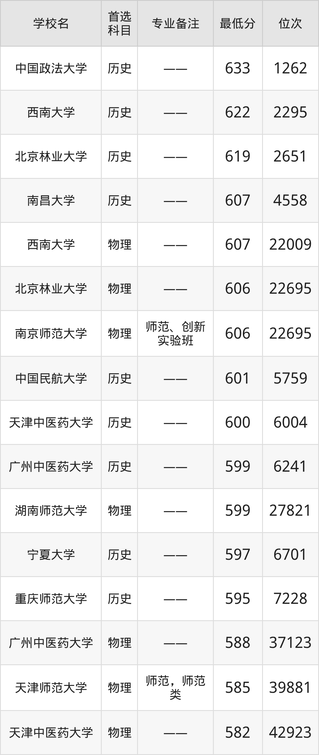 应用心理学分数线排名前五的院校分别是:633分的中国政法大学、622分的西南大学、619分的北京林业大学、607分的南昌大学、606分的南京师范大学(师范、创新实验班)。