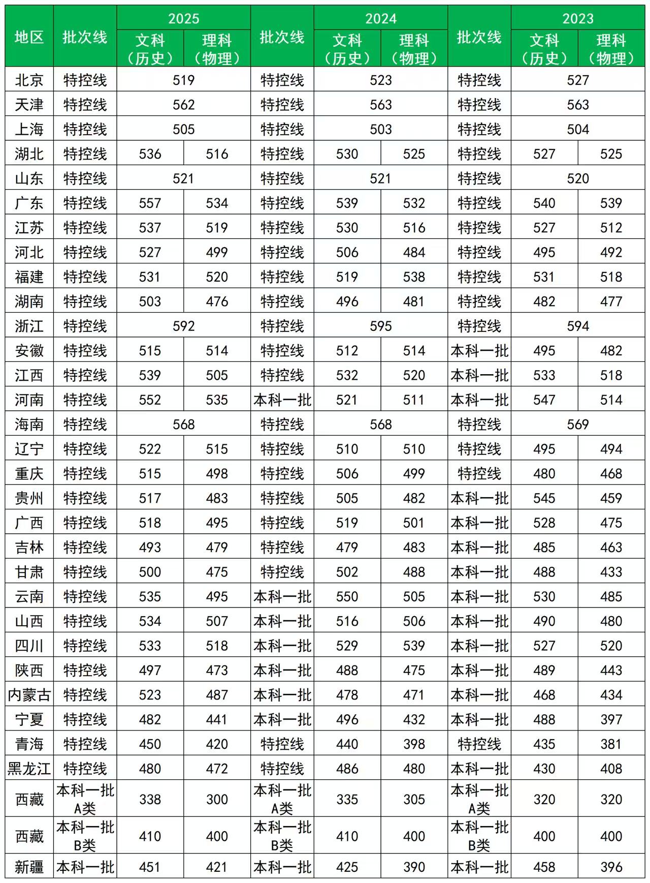 (二)近三年全国各省特控线/一本线一览