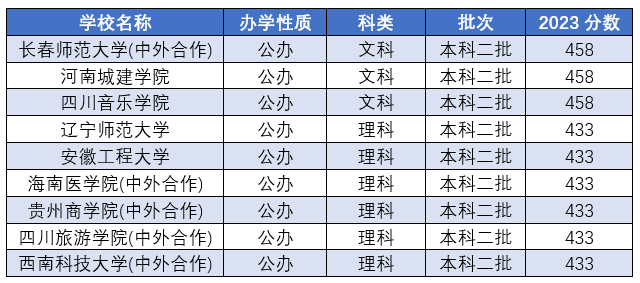 2023年四川省文科刚好在本科二批控制线录取大学有三所,分别是四川音乐学院、河南城建学院、长春师范大学(中外合作);而理科录取的有六所,除辽宁师范大学、安徽工程大学外,其余四所都是中外合作专业录取,这些专业收费都较高,对英语能力有一定要求,考生报考时需注意这点。