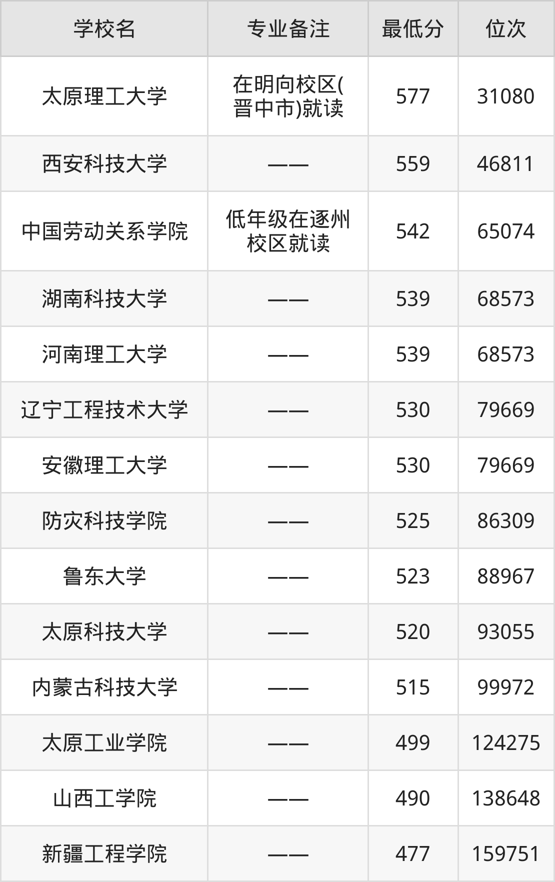 分数线低于520分能上的应急技术与管理大学还有太原科技大学(520分)、内蒙古科技大学(515分)、太原工业学院(499分)、山西工学院(490分)。
