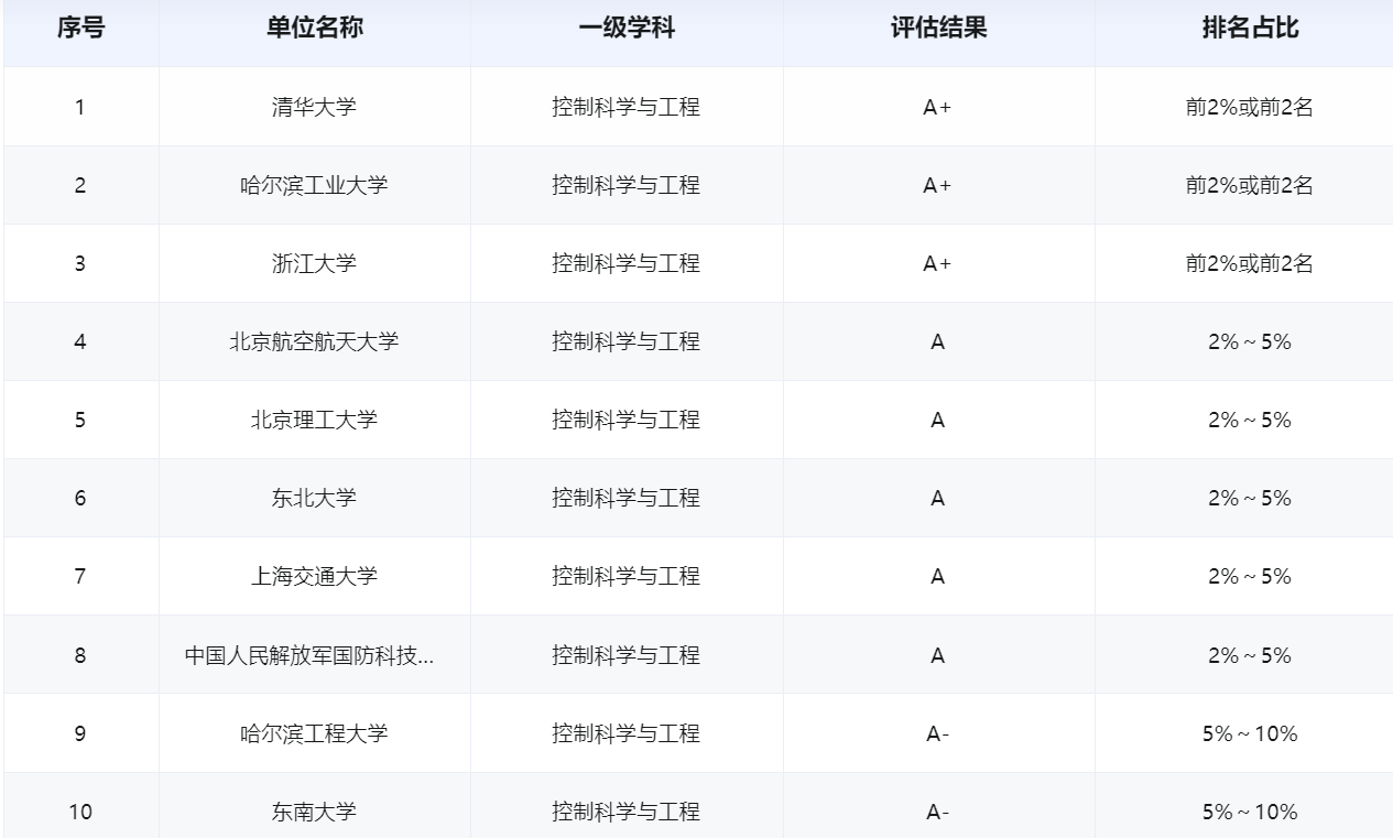 机器人工程专业最早设立于2015年,被设置在自动化大类专业下,而自动化的一级学科是控制科学与工程。所以在筛选高校的时候,可以参考上图的专业排名,也可以看对应一级学科的评估结果,如下图所示。
