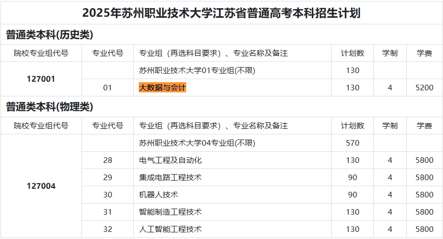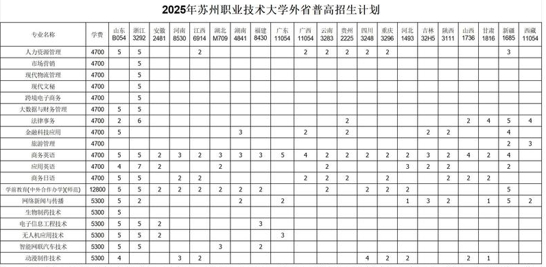 江苏省内专科招生计划可点击右侧链接查看:苏州职业技术大学2025年江苏省普通高考专科招生计划