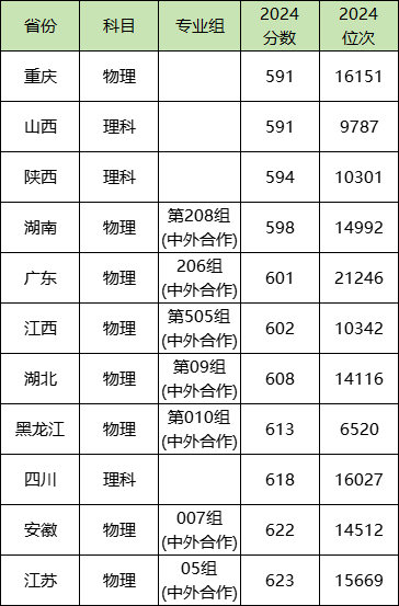 2024年哈尔滨工程大学4+0项目计划内招生分数最低范围在591分~623分之间,其中在重庆和山西的分数最低。下面是各省的招生分数一览表: