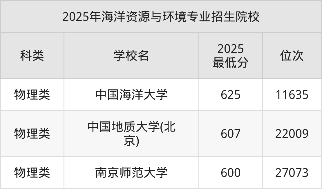 因为各校在不同省市区的收分不一样,为方便对比,这里以河北省高考为例,列举上述院校2025年在河北海洋资源与环境招生分数情况。