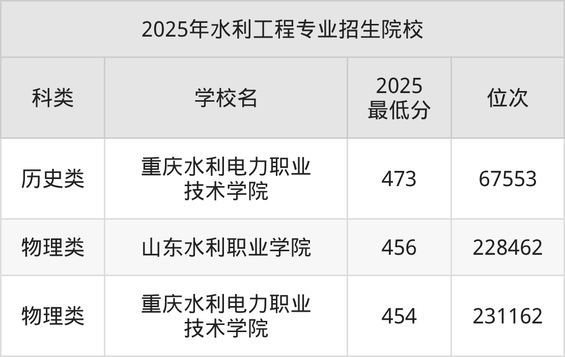 数据显示,水利工程最好大学的收分在454分及以上,其中重庆水利电力职业技术学院最低分达到了473分,对应最低位次为67553名。