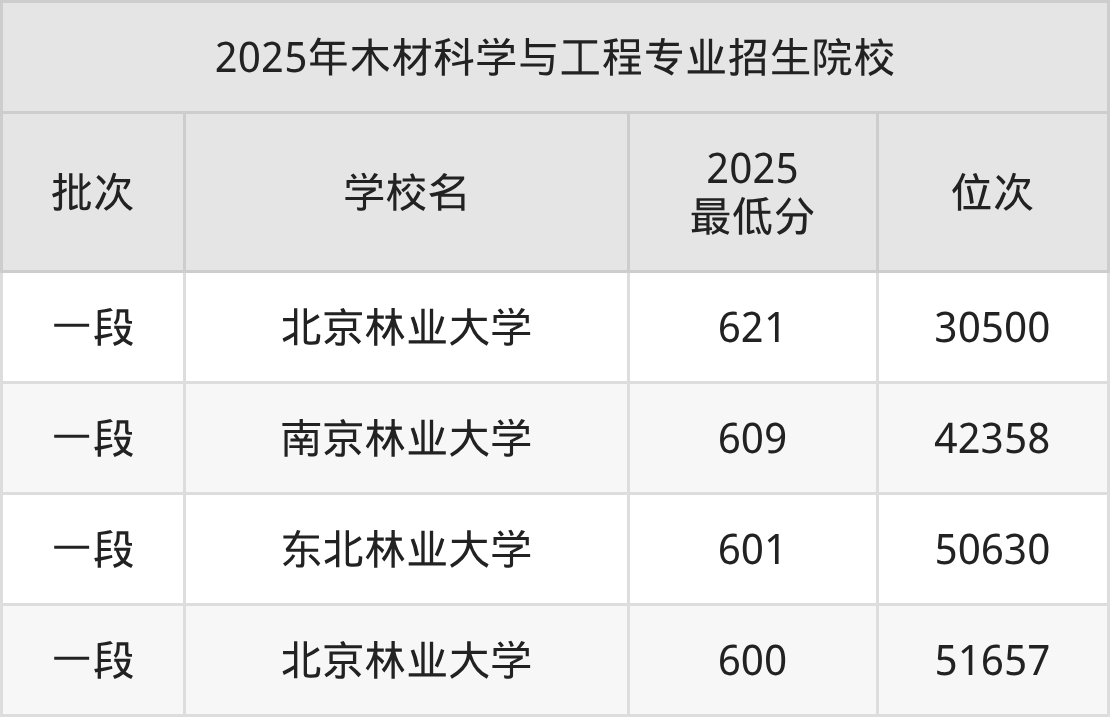 数据显示,木材科学与工程最好大学的收分在600分及以上,其中北京林业大学(德语复合人才实验班)最低分达到了621分,对应最低位次为30500名。