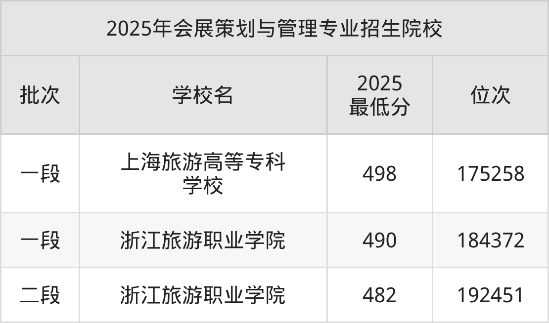 数据显示,会展策划与管理最好大学的收分在482分及以上,其中上海旅游高等专科学校最低分达到了498分,对应最低位次为175258名。