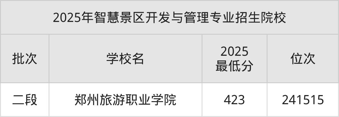 因为各校在不同省市区的收分不一样,为方便对比,这里以浙江省高考为例,列举上述院校2025年在浙江智慧景区开发与管理招生分数情况。