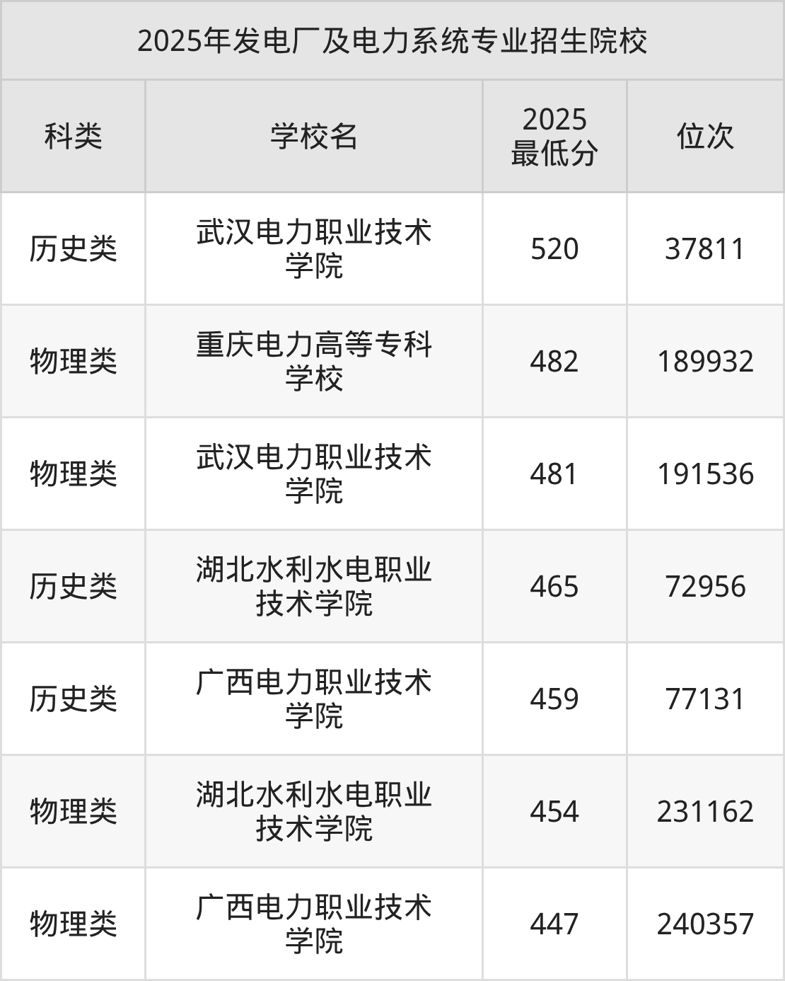 数据显示,发电厂及电力系统最好大学的收分在447分及以上,其中武汉电力职业技术学院最低分达到了520分,对应最低位次为37811名。