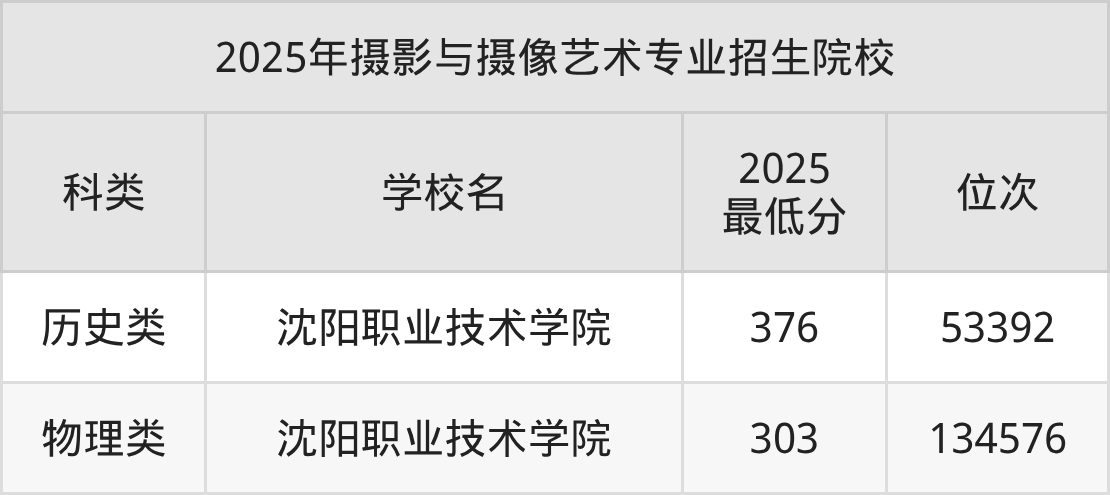 数据显示,摄影与摄像艺术最好大学的收分在303分及以上,其中沈阳职业技术学院最低分达到了376分,对应最低位次为53392名。
