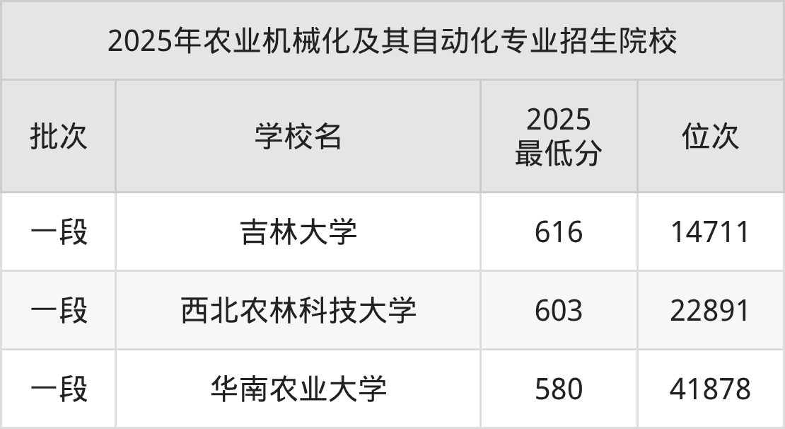 数据显示,农业机械化及其自动化最好大学的收分在580分及以上,其中吉林大学最低分达到了616分,对应最低位次为14711名。