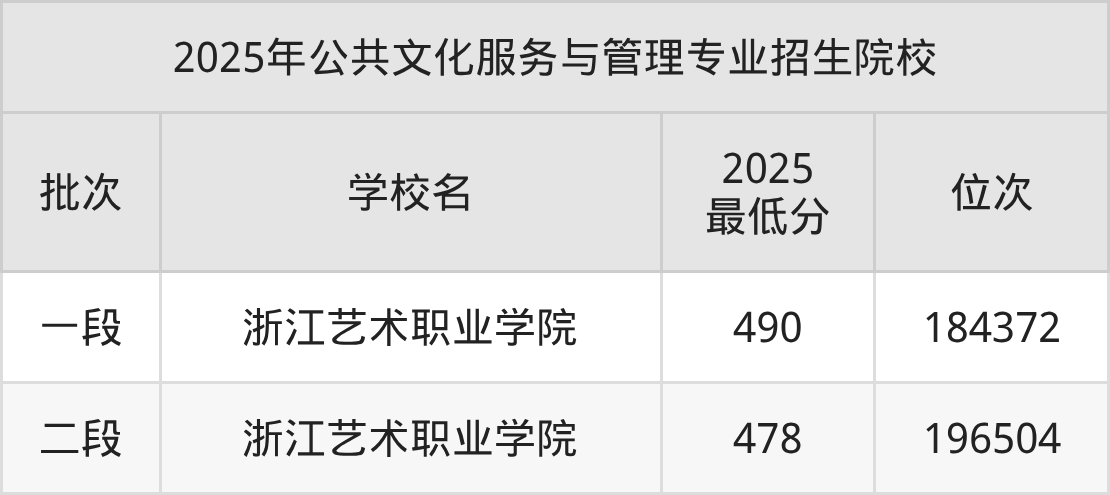 数据显示,公共文化服务与管理最好大学的收分在478分及以上,其中浙江艺术职业学院最低分达到了490分,对应最低位次为184372名。