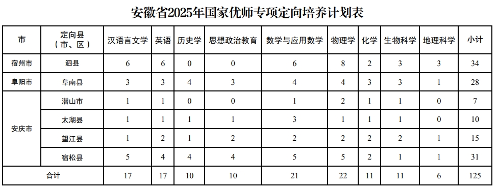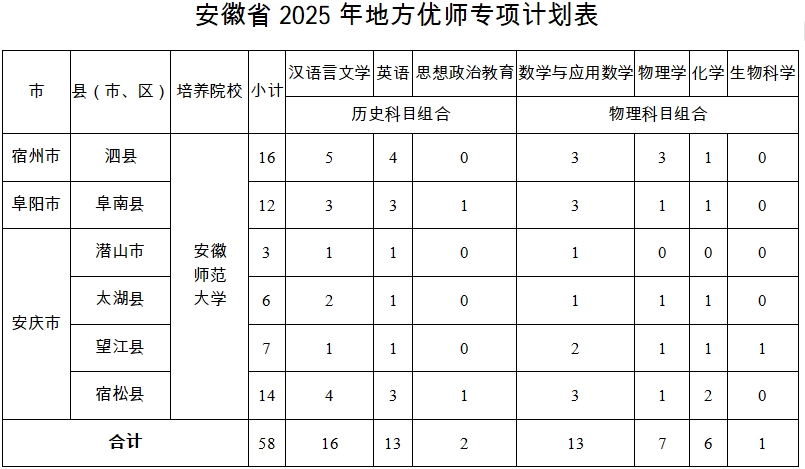 优师专项定向县(市、区):宿州市泗县,阜阳市阜南县,安庆市潜山市、太湖县、望江县、宿松县。