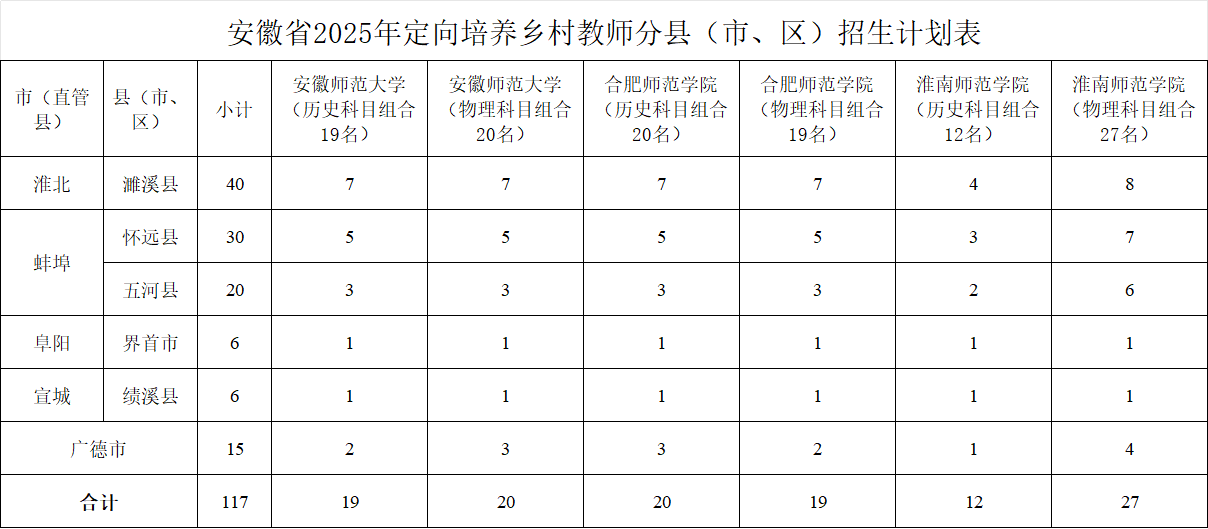 本科层次乡村小学全科型教师公费定向培养招生计划:117人。