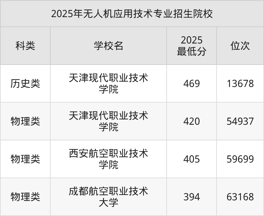 因为各校在不同省市区的收分不一样,为方便对比,这里以内蒙古自治区高考为例,列举上述院校2025年在内蒙古无人机应用技术招生分数情况。