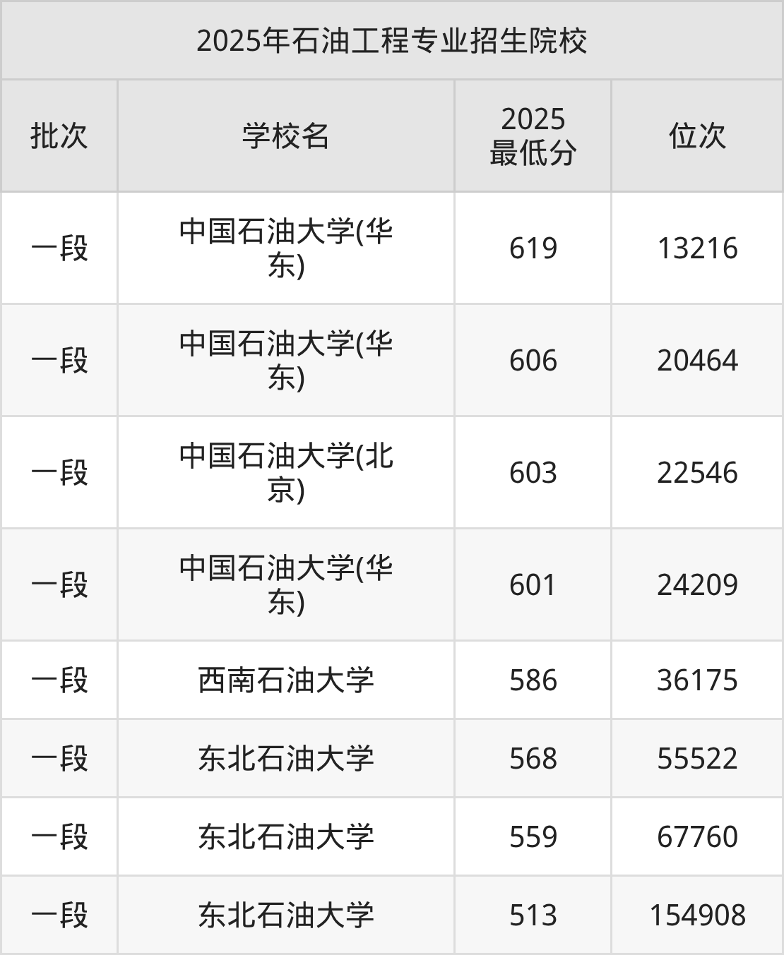 数据显示,石油工程最好大学的收分在513分及以上,其中中国石油大学(华东)(菁英班)最低分达到了619分,对应最低位次为13216名。