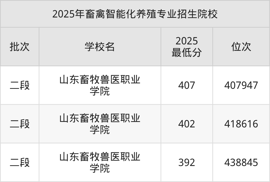 因为各校在不同省市区的收分不一样,为方便对比,这里以山东省高考为例,列举上述院校2025年在山东畜禽智能化养殖招生分数情况。