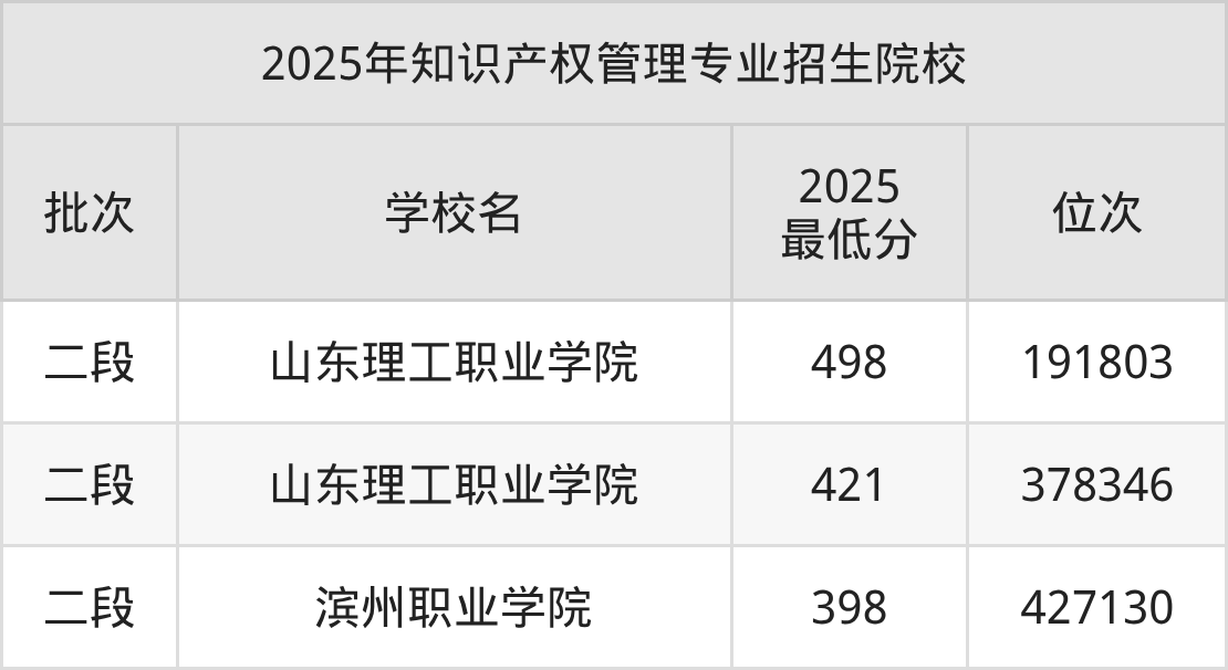 因为各校在不同省市区的收分不一样,为方便对比,这里以山东省高考为例,列举上述院校2025年在山东知识产权管理招生分数情况。
