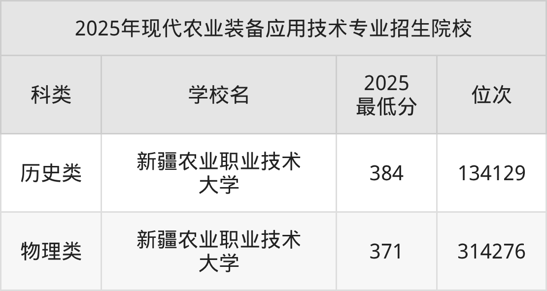 数据显示,现代农业装备应用技术最好大学的收分在371分及以上,其中新疆农业职业技术大学(农林类)最低分达到了384分,对应最低位次为134129名。