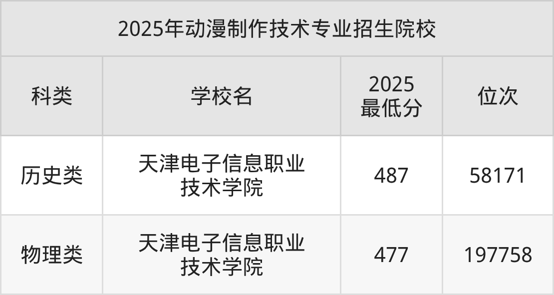 数据显示,动漫制作技术最好大学的收分在477分及以上,其中天津电子信息职业技术学院最低分达到了487分,对应最低位次为58171名。