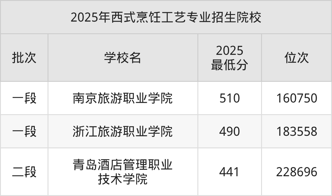因为各校在不同省市区的收分不一样,为方便对比,这里以浙江省高考为例,列举上述院校2025年在浙江西式烹饪工艺招生分数情况。