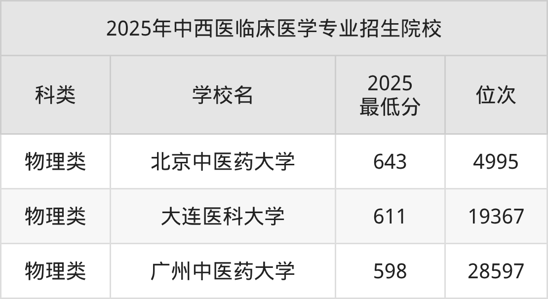 因为各校在不同省市区的收分不一样,为方便对比,这里以河北省高考为例,列举上述院校2025年在河北中西医临床医学招生分数情况。
