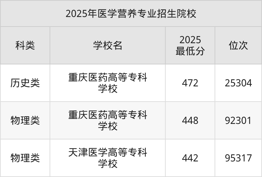 因为各校在不同省市区的收分不一样,为方便对比,这里以重庆市高考为例,列举上述院校2025年在重庆医学营养招生分数情况。