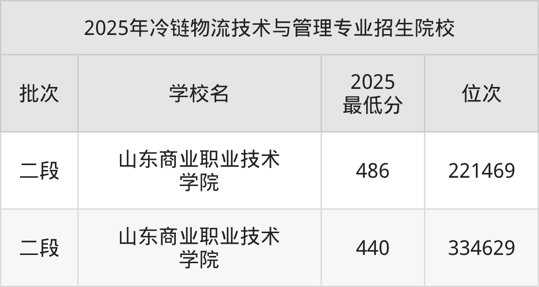 因为各校在不同省市区的收分不一样,为方便对比,这里以山东省高考为例,列举上述院校2025年在山东冷链物流技术与管理招生分数情况。
